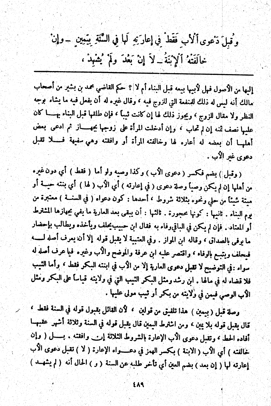 وَصِلَةُ قُبِلَ (بِيَمِينٍ) هَذَا تَلْفِيقٌ مِنْ قَوْلَيْنِ لِأَنَّ الْقَائِلَ بِقَبُولِ قَوْلِهِ فِي السَّنَةِ فَقَطْ، قَالَ يُقْبَلُ قَوْلُهُ بِلَا يَمِينٍ، وَمَنْ اشْتَرَطَ الْيَمِينَ قَالَ يُقْبَلُ قَوْلُهُ فِي السَّنَةِ وَثَلَاثَةِ أَشْهُرٍ عَقِبَهَا أَفَادَهُ الْحَطّ، وَتُقْبَلُ دَعْوَى الْأَبِ الْإِعَارَةَ بِالشُّرُوطِ الثَّلَاثَةِ إنْ وَافَقَتْهُ. بَلْ (وَإِنْ خَالَفَتْهُ) أَيْ الْأَبَ (الِابْنَةُ) بِكَسْرِ الْهَمْزِ فِي دَعْوَاهُ الْإِعَارَةَ (لَا) تُقْبَلُ دَعْوَى الْأَبِ إعَارَتَهُ لَهَا (إنْ بَعُدَ) بِضَمِّ الْعَيْنِ أَيْ تَأَخَّرَ طَلَبُهُ عَنْ السَّنَةِ (وَ) الْحَال أَنَّهُ (لَمْ يُشْهِدْ)