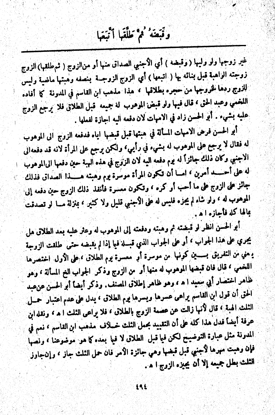 ـــــــــــــــــــــــــــــQغَيْرِ زَوْجِهَا وَلَوْ وَلِيَّهَا (وَقَبَضَهُ) أَيْ الْأَجْنَبِيُّ الصَّدَاقَ مِنْهَا أَوْ مِنْ الزَّوْجِ (ثُمَّ طَلَّقَهَا) الزَّوْجُ زَوْجَتَهُ الْوَاهِبَةَ قَبْلَ بِنَائِهِ بِهَا (اتَّبَعَهَا) أَيْ الزَّوْجُ الزَّوْجَةَ بِنِصْفِهِ وَهِبَتُهَا مَاضِيَةٌ وَلَيْسَ لِلزَّوْجِ رَدُّهَا لِخُرُوجِهَا مِنْ حِجْرِهِ بِطَلَاقِهَا، هَذَا مَذْهَبُ ابْنِ الْقَاسِمِ فِي الْمُدَوَّنَةِ كَمَا أَفَادَهُ اللَّخْمِيُّ وَعَبْدُ الْحَقِّ، قَالَ فِيهَا وَلَوْ قَبَضَ الْمَوْهُوبُ لَهُ جَمِيعَهُ قَبْلَ الطَّلَاقِ فَلَا يَرْجِعُ الزَّوْجُ عَلَيْهِ بِشَيْءٍ. أَبُو الْحَسَنِ زَادَ فِي الْأُمَّهَاتِ لِأَنَّ دَفْعَهُ إلَيْهِ إجَازَةُ لِفِعْلِهَا.