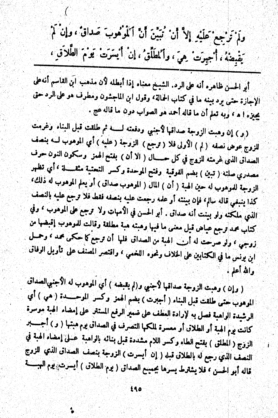 (وَ) إنْ وَهَبَتْ الزَّوْجَةُ صَدَاقَهَا لِأَجْنَبِيٍّ وَدَفَعَتْهُ لَهُ ثُمَّ طَلُقَتْ قَبْلَ الْبِنَاءِ وَغَرِمَتْ لِلزَّوْجِ عِوَضَ نِصْفِهِ (لَمْ) الْأَوْلَى فَلَا (تَرْجِعْ) الزَّوْجَةُ (عَلَيْهِ) أَيْ الْمَوْهُوبِ لَهُ بِنِصْفِ الصَّدَاقِ الَّذِي غَرِمَتْهُ لِلزَّوْجِ فِي كُلِّ حَالٍ (إلَّا أَنْ) بِفَتْحِ الْهَمْزِ، وَسُكُونِ النُّونِ حَرْفٌ مَصْدَرِيٌّ صِلَتُهُ (تُبَيِّنَ) بِضَمِّ الْفَوْقِيَّةِ وَفَتْحِ الْمُوَحَّدَةِ وَكَسْرِ التَّحْتِيَّةِ مُثَقَّلَةً، أَيْ تُظْهِرَ الزَّوْجَةُ لِلْمَوْهُوبِ لَهُ حِينَ الْهِبَةِ (أَنَّ) الْمَالَ (الْمَوْهُوبَ صَدَاقٌ) أَوْ يَعْلَمُ الْمَوْهُوبُ لَهُ ذَلِكَ، كَذَا يَنْبَغِي قَالَهُ سَالِمٌ، فَإِنْ بَيَّنَتْهُ أَوْ عَلِمَهُ رَجَعَتْ عَلَيْهِ بِنِصْفِهِ فَقَطْ فَلَا تَرْجِعُ عَلَيْهِ بِالنِّصْفِ الَّذِي مَلَكَتْهُ وَلَوْ بَيَّنَتْ أَنَّهُ صَدَاقٌ. أَبُو الْحَسَنِ فِي الْأُمَّهَاتِ وَلَا تَرْجِعُ عَلَى الْمَوْهُوبِ، وَفِي كِتَابِ مُحَمَّدٍ تَرْجِعُ عِيَاضٌ قِيلَ مَعْنَى مَا فِيهَا وَهَبَتْهُ هِبَةً مُطْلَقَةً وَقَالَتْ لِلْمَوْهُوبِ اقْبِضْهَا مِنْ زَوْجِي، وَلَوْ صَرَّحَتْ لَهُ أَنَّ الْهِبَةَ مِنْ الصَّدَاقِ فَلَهَا أَنْ تَرْجِعَ كَمَا حَكَى مُحَمَّدٌ، وَحَمَلَ ابْنُ يُونُسَ مَا فِي الْكِتَابَيْنِ عَلَى الْخِلَافِ وَنَحْوُهُ اللَّخْمِيُّ، وَاقْتَصَرَ الْمُصَنِّفُ عَلَى تَأْوِيلِ الْوِفَاقِ وَاَللَّهُ أَعْلَمُ.