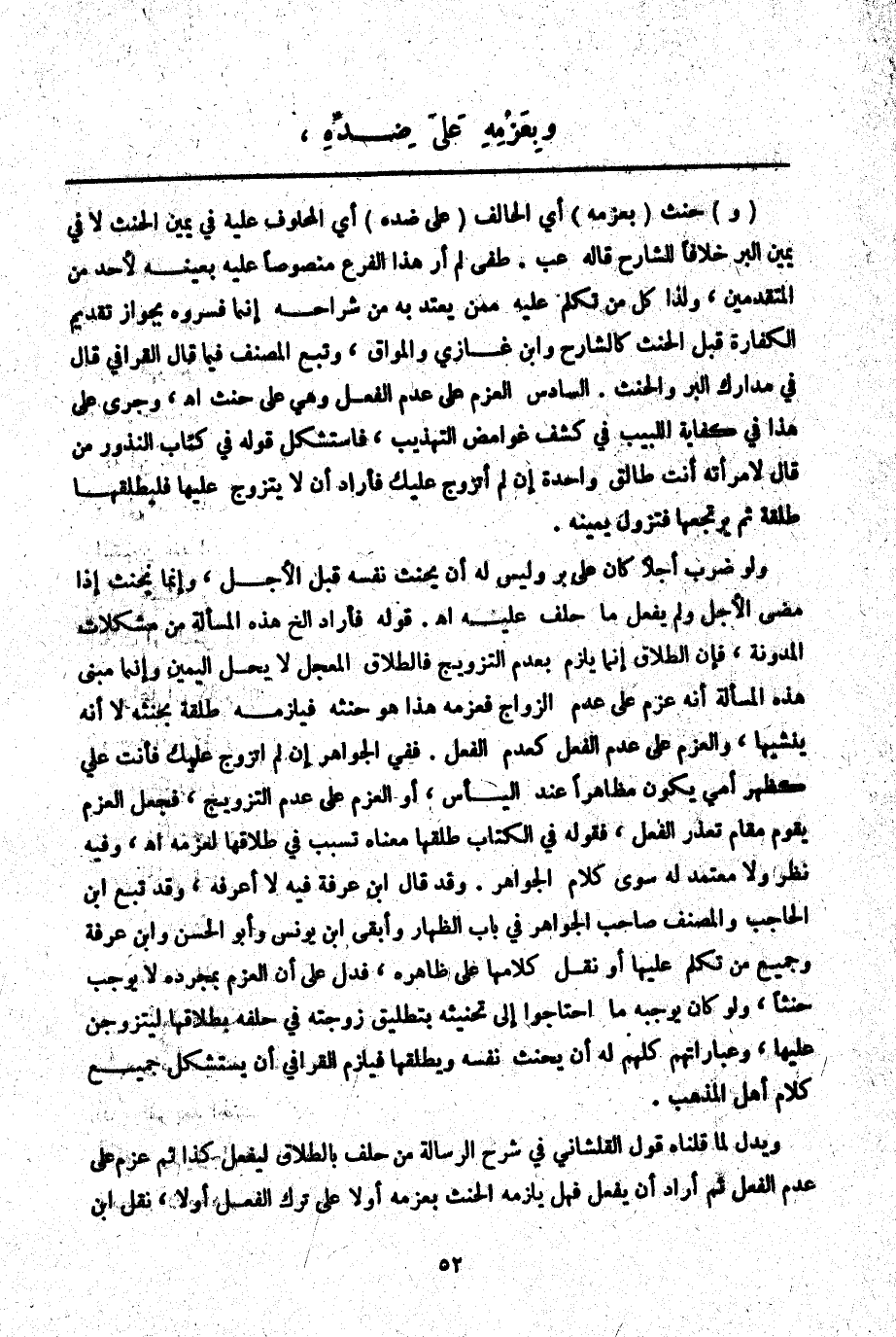 ـــــــــــــــــــــــــــــQوَ) حَنِثَ (بِعَزْمِهِ) أَيْ الْحَالِفِ (عَلَى ضِدِّهِ) أَيْ الْمَحْلُوفِ عَلَيْهِ فِي يَمِينِ الْحِنْثِ لَا فِي يَمِينِ الْبِرِّ خِلَافًا للِشَّارِحِ قَالَهُ عب. طفي لَمْ أَرَ هَذَا الْفَرْعَ مَنْصُوصًا عَلَيْهِ بِعَيْنِهِ لِأَحَدٍ مِنْ الْمُتَقَدِّمِينَ، وَلِذَا كُلُّ مَنْ تَكَلَّمَ عَلَيْهِ مِمَّنْ يُعْتَدُّ بِهِ مِنْ شُرَّاحِهِ إنَّمَا فَسَّرُوهُ بِجَوَازِ تَقْدِيمِ الْكَفَّارَةِ قَبْلَ الْحِنْثِ كَالشَّارِحِ وَابْنِ غَازِيٍّ وَالْمَوَّاقِ، وَتَبِعَ الْمُصَنِّفُ فِيمَا قَالَ الْقَرَافِيُّ قَالَ فِي مَدَارِكِ الْبِرِّ وَالْحِنْثِ. السَّادِسُ الْعَزْمُ عَلَى عَدَمِ الْفِعْلِ، وَهِيَ عَلَى حِنْثٍ. اهـ. وَجَرَى عَلَى هَذَا فِي كِفَايَةِ اللَّبِيبِ فِي كَشْفِ غَوَامِضِ التَّهْذِيبِ، فَاسْتَشْكَلَ قَوْلَهُ فِي كِتَابِ النُّذُورِ مَنْ قَالَ لِامْرَأَتِهِ: أَنْتِ طَالِقٌ وَاحِدَةً إنْ لَمْ أَتَزَوَّجْ عَلَيْكِ فَأَرَادَ أَنْ لَا يَتَزَوَّجَ عَلَيْهَا فَلْيُطَلِّقْهَا طَلْقَةً ثُمَّ يَرْتَجِعْهَا فَتَزُولُ يَمِينُهُ.