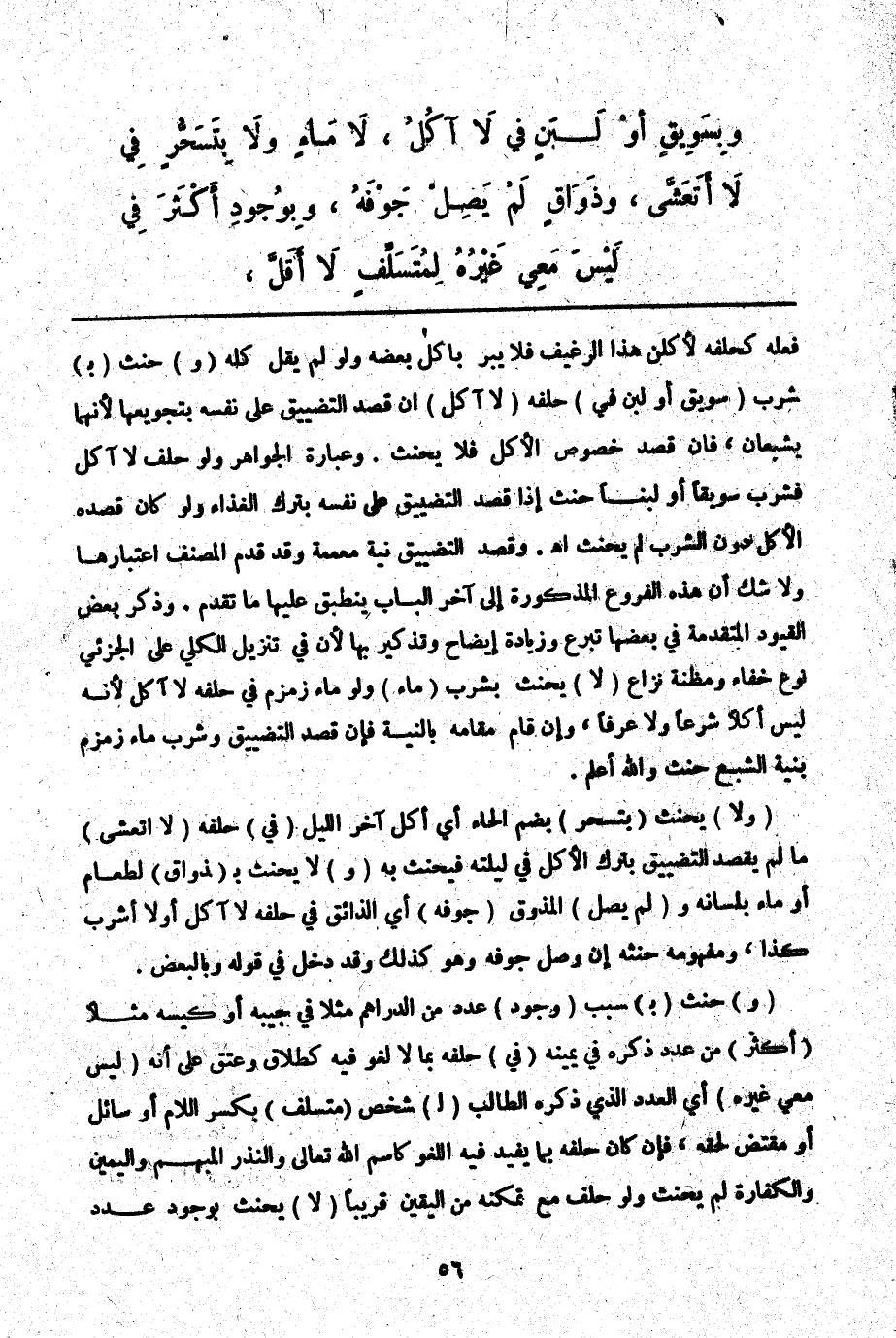 ـــــــــــــــــــــــــــــQفِعْلِهِ كَحَلِفِهِ لَآكُلَنَّ هَذَا الرَّغِيفَ فَلَا يَبَرُّ بِأَكْلِ بَعْضِهِ وَلَوْ لَمْ يَقُلْ كُلَّهُ (وَ) حَنِثَ (بِ) شُرْبِ (سَوِيقٍ أَوْ لَبَنٍ فِي) حَلِفِهِ (لَا آكُلُ) إنْ قَصَدَ التَّضْيِيقَ عَلَى نَفْسِهِ بِتَجْوِيعِهَا لِأَنَّهُمَا يُشْبِعَانِ، فَإِنْ قَصَدَ خُصُوصَ الْأَكْلِ فَلَا يَحْنَثُ. وَعِبَارَةُ الْجَوَاهِرِ وَلَوْ حَلَفَ لَا آكُلُ فَشَرِبَ سَوِيقًا أَوْ لَبَنًا حَنِثَ إذَا قَصَدَ التَّضْيِيقَ عَلَى نَفْسِهِ بِتَرْكِ الْغِذَاءِ وَلَوْ كَانَ قَصْدُهُ الْأَكْلَ دُونَ الشُّرْبِ لَمْ يَحْنَثْ اهـ. وَقَصْدُ التَّضْيِيقِ نِيَّةٌ مُعَمِّمَةٌ وَقَدْ قَدَّمَ الْمُصَنِّفُ اعْتِبَارَهَا وَلَا شَكَّ أَنَّ هَذِهِ الْفُرُوعَ الْمَذْكُورَةَ إلَى آخِرِ الْبَابِ يَنْطَبِقُ عَلَيْهَا مَا تَقَدَّمَ. وَذِكْرُ بَعْضِ الْقُيُودِ الْمُتَقَدِّمَةِ فِي بَعْضِهَا تَبَرُّعٌ وَزِيَادَةُ إيضَاحٍ وَتَذْكِيرٌ بِهَا؛ لِأَنَّ فِي تَنْزِيلِ الْكُلِّيِّ عَلَى الْجُزْئِيِّ نَوْعَ خَفَاءٍ وَمَظِنَّةَ نِزَاعٍ (لَا) يَحْنَثُ بِشُرْبِ (مَاءٍ) وَلَوْ مَاءَ زَمْزَمَ فِي حَلِفِهِ لَا آكُلُ لِأَنَّهُ لَيْسَ أَكْلًا شَرْعًا وَلَا عُرْفًا، وَإِنْ قَامَ مَقَامَهُ بِالنِّيَّةِ فَإِنْ قَصَدَ التَّضْيِيقَ وَشَرِبَ مَاءَ زَمْزَمَ بِنِيَّةِ الشِّبَعِ حَنِثَ وَاَللَّهُ أَعْلَمُ.