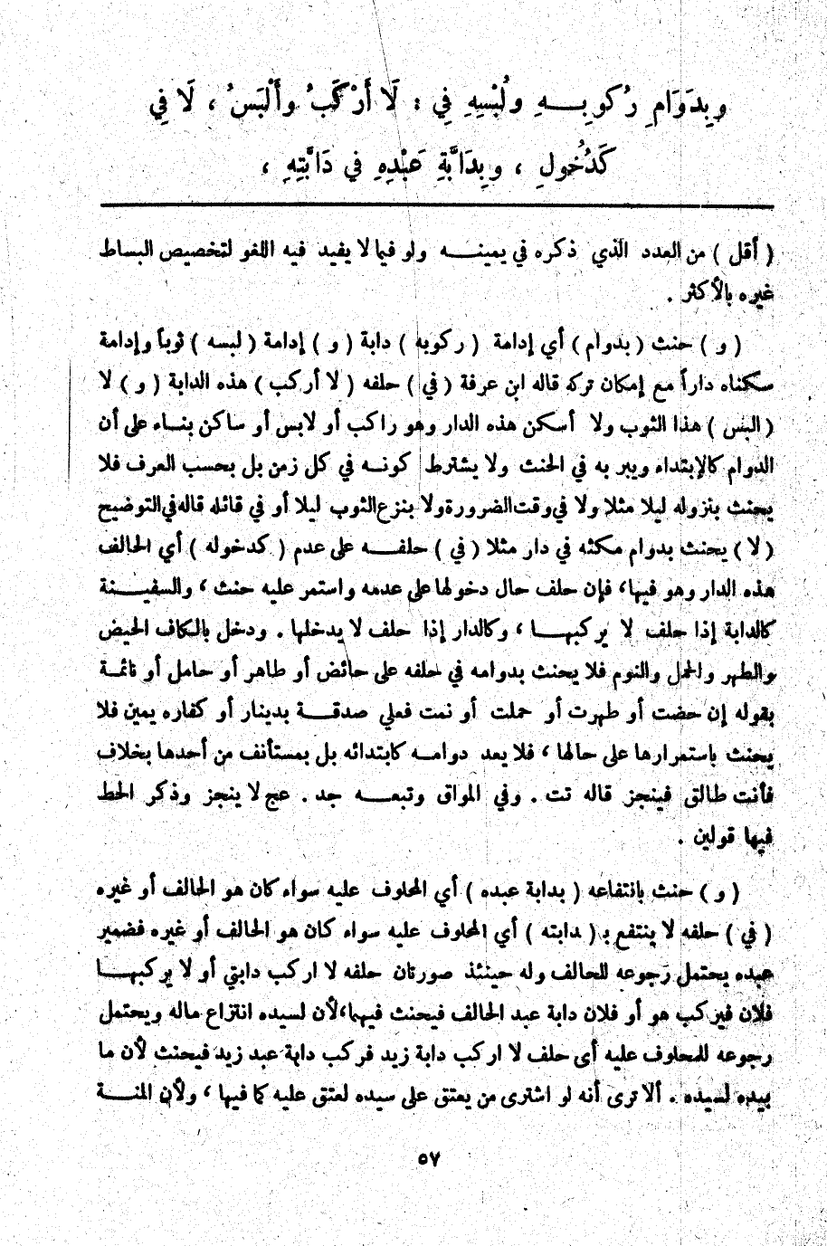 (وَ) حَنِثَ (بِدَوَامِ) أَيْ إدَامَةِ (رُكُوبِهِ) دَابَّةً (وَ) إدَامَةِ (لُبْسِهِ) ثَوْبًا وَإِدَامَةِ سُكْنَاهُ دَارًا مَعَ إمْكَانِ تَرْكِهِ قَالَهُ ابْنُ عَرَفَةَ (فِي) حَلِفِهِ (لَا أَرْكَبُ) هَذِهِ الدَّابَّةَ (وَ) لَا (أَلْبَسُ) هَذَا الثَّوْبَ وَلَا أَسْكُنُ هَذِهِ الدَّارَ وَهُوَ رَاكِبٌ أَوْ لَابِسٌ أَوْ سَاكِنٌ بِنَاءً عَلَى أَنَّ الدَّوَامَ كَالِابْتِدَاءِ وَيَبَرُّ بِهِ فِي الْحِنْثِ وَلَا يُشْتَرَطُ كَوْنُهُ فِي كُلِّ زَمَنٍ بَلْ بِحَسَبِ الْعُرْفِ فَلَا يَحْنَثُ بِنُزُولِهِ لَيْلًا مَثَلًا وَلَا فِي وَقْتِ الضَّرُورَةِ وَلَا بِنَزْعِ الثَّوْبِ لَيْلًا أَوْ فِي قَائِلَةٍ قَالَهُ فِي التَّوْضِيحِ (لَا) يَحْنَثُ بِدَوَامِ مُكْثِهِ فِي دَارٍ مَثَلًا (فِي) حَلِفِهِ عَلَى عَدَمٍ (كَدُخُولِهِ) أَيْ الْحَالِفِ هَذِهِ الدَّارَ وَهُوَ فِيهَا، فَإِنْ حَلَفَ حَالَ دُخُولِهَا عَلَى عَدَمِهِ وَاسْتَمَرَّ عَلَيْهِ حَنِثَ، وَالسَّفِينَةُ كَالدَّابَّةِ إذَا حَلَفَ لَا يَرْكَبُهَا، وَكَالدَّارِ إذَا حَلَفَ لَا يَدْخُلُهَا. وَدَخَلَ بِالْكَافِ الْحَيْضُ وَالطُّهْرُ وَالْحَمْلُ وَالنَّوْمُ فَلَا يَحْنَثُ بِدَوَامِهِ فِي حَلِفِهِ عَلَى حَائِضٍ أَوْ طَاهِرٍ أَوْ حَامِلٍ أَوْ نَائِمَةٍ بِقَوْلِهِ إنْ حِضْت أَوْ طَهُرْت أَوْ حَمَلْت أَوْ نِمْت فَعَلَيَّ صَدَقَةٌ بِدِينَارٍ أَوْ كَفَّارَةُ يَمِينٍ فَلَا يَحْنَثُ بِاسْتِمْرَارِهَا عَلَى حَالِهَا، فَلَا يُعَدُّ دَوَامُهُ كَابْتِدَائِهِ بَلْ بِمُسْتَأْنَفٍ مِنْ أَحَدِهَا بِخِلَافِ فَأَنْتِ طَالِقٌ فَيُنْجَزُ قَالَهُ تت. وَفِي الْمَوَّاقِ وَتَبِعَهُ جَدّ عج لَا يُنْجَزُ وَذَكَرَ الْحَطّ فِيهَا قَوْلَيْنِ.