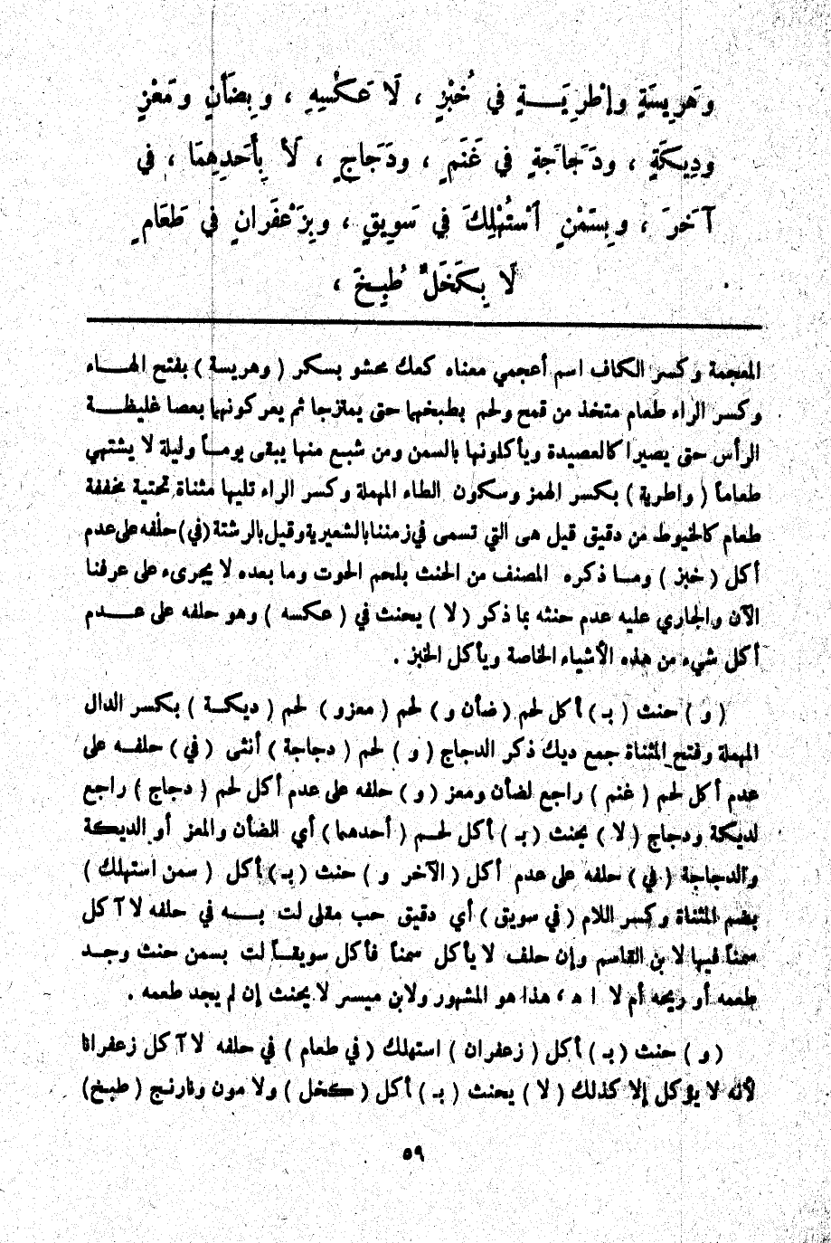 ـــــــــــــــــــــــــــــQالْمُعْجَمَةِ وَكَسْرِ الْكَافِ اسْمٌ أَعْجَمِيٌّ مَعْنَاهُ كَعْكٌ مَحْشُوٌّ بِسُكَّرٍ (وَهَرِيسَةٍ) بِفَتْحِ الْهَاءِ وَكَسْرِ الرَّاءِ طَعَامٌ مُتَّخَذٌ مِنْ قَمْحٍ وَلَحْمٍ بِطَبْخِهِمَا حَتَّى يَمْتَزِجَا ثُمَّ يَعْرُكُونَهُمَا بِعَصًا غَلِيظَةِ الرَّأْسِ حَتَّى يَصِيرَا كَالْعَصِيدَةِ وَيَأْكُلُونَهَا بِالسَّمْنِ وَمَنْ شَبِعَ مِنْهَا يَبْقَى يَوْمًا وَلَيْلَةً لَا يَشْتَهِي طَعَامًا (وَإِطْرِيَةٍ) بِكَسْرِ الْهَمْزِ وَسُكُونِ الطَّاءِ الْمُهْمَلَةِ وَكَسْرِ الرَّاءِ تَلِيهَا مُثَنَّاةٌ تَحْتِيَّةٌ مُخَفَّفَةٌ طَعَامٌ كَالْخُيُوطِ مِنْ دَقِيقٍ قِيلَ هِيَ الَّتِي تُسَمَّى فِي زَمَنِنَا بِالشَّعِيرِيَّةِ وَقِيلَ بِالرِّشْتَةِ (فِي) حَلِفِهِ عَلَى عَدَمِ أَكْلِ (خُبْزٍ) وَمَا ذَكَرَهُ الْمُصَنِّفُ مِنْ الْحِنْثِ بِلَحْمِ الْحُوتِ وَمَا بَعْدَهُ لَا يَجْرِي عَلَى عُرْفِنَا الْآنَ وَالْجَارِي عَلَيْهِ عَدَمُ حِنْثِهِ بِمَا ذُكِرَ (لَا) يَحْنَثُ فِي (عَكْسِهِ) وَهُوَ حَلِفُهُ عَلَى عَدَمِ أَكْلِ شَيْءٍ مِنْ هَذِهِ الْأَشْيَاءِ الْخَاصَّةِ وَيَأْكُلُ الْخُبْزَ.
