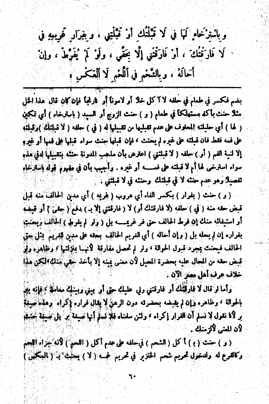 ـــــــــــــــــــــــــــــQبِضَمٍّ فَكَسْرٍ فِي طَعَامٍ فِي حَلِفِهِ لَا آكُلُ خَلًّا أَوْ لَامُونًا أَوْ نَارِنْجًا فَإِنْ كَانَ قَالَ هَذَا الْخَلَّ مَثَلًا حَنِثَ بِأَكْلِهِ مُسْتَهْلَكًا فِي طَعَامٍ (وَ) حَنِثَ الزَّوْجُ أَوْ السَّيِّدُ (بِاسْتِرْخَاءٍ) أَيْ تَمْكِينٍ (لَهَا) أَيْ حَلِيلَتِهِ الْمَحْلُوفِ عَلَى عَدَمِ تَقْبِيلِهَا مِنْ تَقْبِيلِهَا لَهُ (فِي) حَلِفِهِ (لَا قَبَّلْتُكِ) وَقَبَّلَتْهُ عَلَى فَمِهِ فَقَطْ فَإِنْ قَبَّلَتْهُ عَلَى غَيْرِهِ لَمْ يَحْنَثْ، فَإِنْ قَبَّلَهَا حَنِثَ سَوَاءٌ قَبَّلَهَا عَلَى فَمِهَا أَوْ غَيْرِهِ إلَّا لِنِيَّةِ الْفَمِ (أَوْ) حَلِفِهِ (لَا قَبَّلْتِنِي) اُعْتُرِضَ بِأَنَّ مَذْهَبَ الْمُدَوَّنَةِ حِنْثُهُ بِتَقْبِيلِهَا لَهُ فِي هَذِهِ سَوَاءٌ اسْتَرْخَى لَهَا أَمْ لَا قَبَّلَتْهُ عَلَى فَمِهِ أَوْ غَيْرِهِ. وَأُجِيبُ بِأَنَّ فِي مَفْهُومِ قَوْلِهِ بِاسْتِرْخَاءٍ تَفْصِيلًا وَهُوَ عَدَمُ حِنْثِهِ لَا فِي قَبَّلْتُك وَحِنْثُهُ فِي لَا قَبَّلْتِنِي.