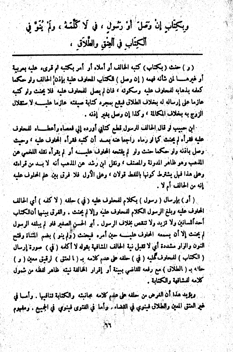 ـــــــــــــــــــــــــــــQوَ) حَنِثَ (بِكِتَابٍ) كَتَبَهُ الْحَالِفُ أَوْ أَمْلَاهُ أَوْ أَمَرَ بِكَتْبِهِ ثُمَّ قُرِئَ عَلَيْهِ بِعَرَبِيَّةٍ أَوْ غَيْرِهَا لِمَنْ شَأْنُهُ فَهْمُهُ (إنْ وَصَلَ) لِلْكِتَابِ الْمَحْلُوفِ عَلَيْهِ بِإِذْنِ الْحَالِفِ وَلَوْ حُكْمًا كَعِلْمِهِ بِذَهَابِهِ لِلْمَحْلُوفِ عَلَيْهِ وَسُكُوتِهِ، فَإِنْ لَمْ يَصِلْ لِلْمَحْلُوفِ عَلَيْهِ فَلَا يَحْنَثُ وَلَوْ كَتَبَهُ عَازِمًا عَلَى إرْسَالِهِ لَهُ بِخِلَافِ الطَّلَاقِ فَيَقَعُ بِمُجَرَّدِ كِتَابَةِ صِيغَتِهِ عَازِمًا عَلَيْهِ لِاسْتِقْلَالِ الزَّوْجِ بِهِ بِخِلَافِ الْمُكَالَمَةِ، وَكَذَا إنْ وَصَلَ بِغَيْرِ إذْنِهِ.