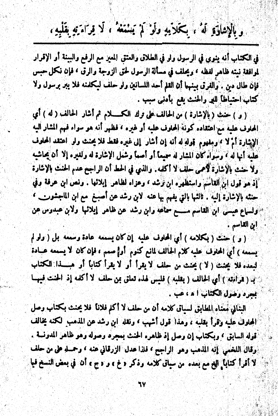 (وَ) حَنِثَ (بِكَلَامِهِ) أَيْ الْمَحْلُوفِ عَلَيْهِ إنْ كَانَ يَسْمَعُهُ عَادَةً وَسَمِعَهُ بَلْ (وَلَوْ لَمْ يَسْمَعْهُ) أَيْ الْمَحْلُوفُ عَلَيْهِ كَلَامَ الْحَالِفِ لِمَانِعٍ كَنَوْمٍ أَوْ صَمَمٍ، فَإِنْ كَانَ لَا يَسْمَعُهُ عَادَةً لِبُعْدِهِ فَلَا يَحْنَثُ (لَا) يَحْنَثُ مَنْ حَلَفَ لَا يَقْرَأُ أَوْ لَا يَقْرَأُ كِتَابًا أَوْ هَذَا الْكِتَابَ بِ (قِرَاءَتِهِ) أَيْ الْحَالِفِ (بِقَلْبِهِ) فَلَيْسَ لِهَذِهِ تَعَلُّقٌ بِمَنْ حَلَفَ لَا أُكَلِّمُهُ إذْ الْحِنْثُ فِيهَا بِمُجَرَّدِ وُصُولِ الْكِتَابِ. اهـ. عب.