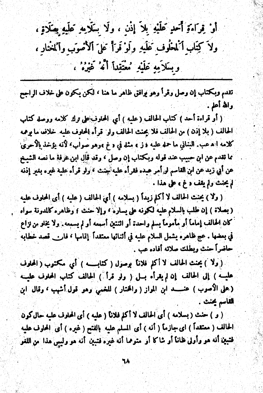 أَوْ قِرَاءَةِ أَحَدٍ عَلَيْهِ بِلَا إذْنٍ، وَلَا بِسَلَامِهِ عَلَيْهِ بِصَلَاةٍ، وَلَا كِتَابِ الْمَحْلُوفِ عَلَيْهِ وَلَوْ قَرَأَ عَلَى الْأَصْوَبِ وَالْمُخْتَارِ، وَبِسَلَامِهِ عَلَيْهِ مُعْتَقِدًا أَنَّهُ غَيْرُهُ،