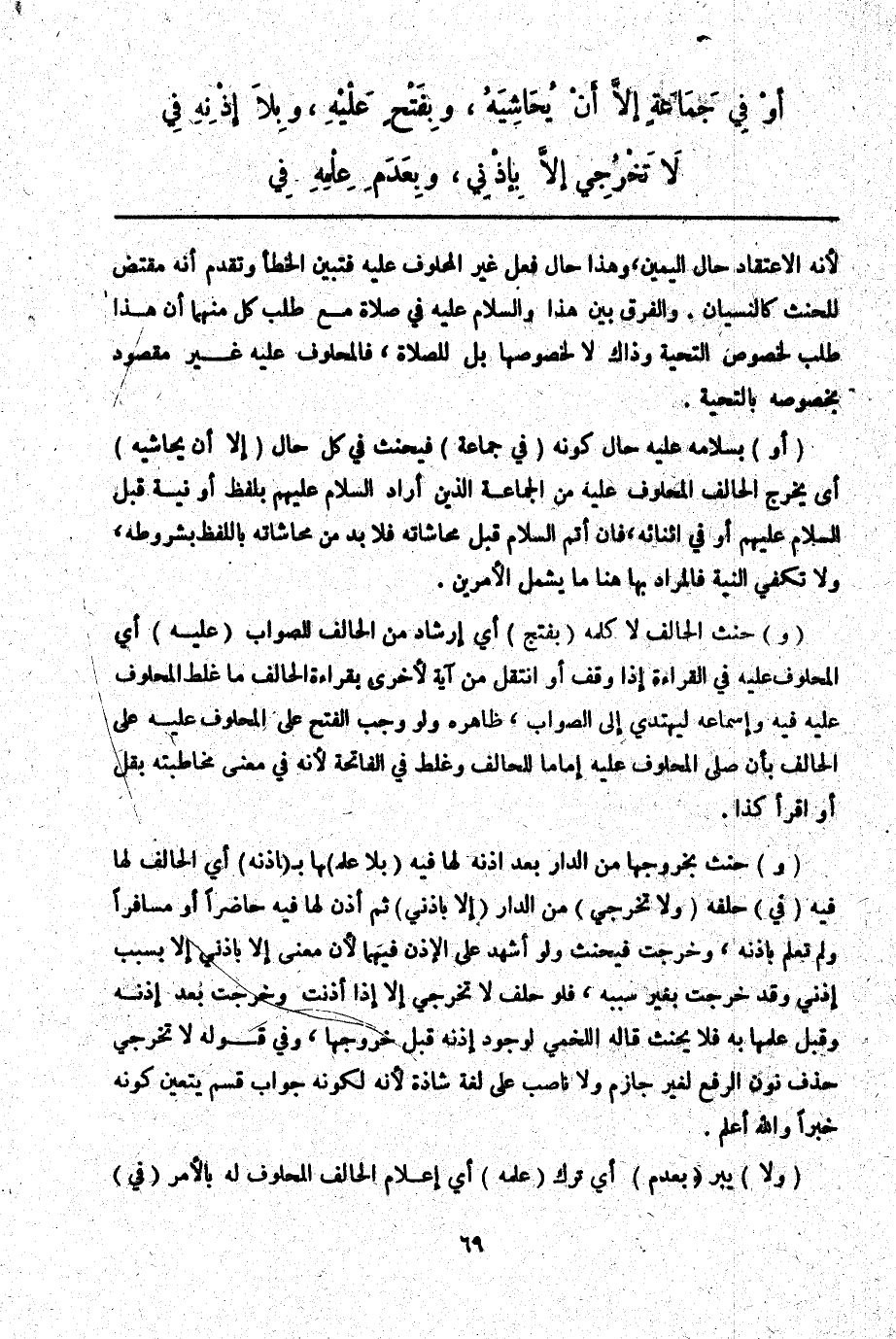 أَوْ فِي جَمَاعَةٍ إلَّا أَنْ يُحَاشِيَهُ، وَبِفَتْحٍ عَلَيْهِ، وَبِلَا إذْنِهِ فِي لَا تَخْرُجِي إلَّا بِإِذْنِي