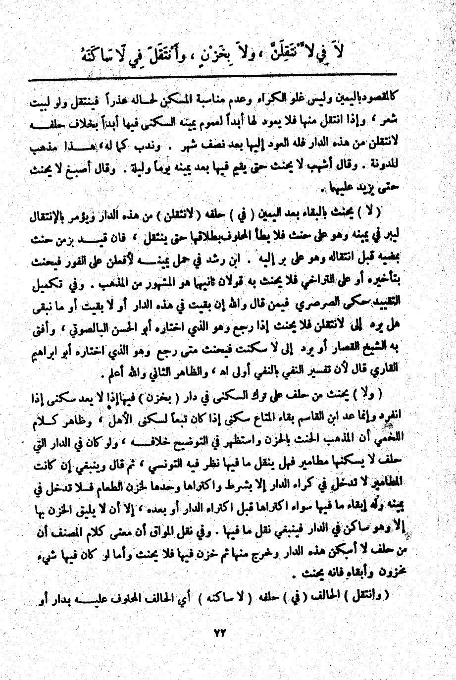 (وَلَا) يَحْنَثُ مَنْ حَلَفَ عَلَى تَرْكِ السُّكْنَى فِي دَارٍ (بِخَزْنٍ) فِيهَا إذْ لَا يُعَدُّ سُكْنَى إذَا انْفَرَدَ وَإِنَّمَا عَدَّ ابْنُ الْقَاسِمِ بَقَاءَ الْمَتَاعِ سُكْنَى إذَا كَانَ تَبَعًا لِسُكْنَى الْأَهْلِ، وَظَاهِرُ كَلَامِ اللَّخْمِيِّ أَنَّ الْمَذْهَبَ الْحِنْثُ بِالْخَزْنِ وَاسْتَظْهَرَ فِي التَّوْضِيحِ خِلَافَهُ، وَلَوْ كَانَ فِي الدَّارِ الَّتِي حَلَفَ لَا يَسْكُنُهَا مَطَامِيرَ فَهَلْ يَنْقُلُ مَا فِيهَا نَظَرَ فِيهِ التُّونُسِيُّ، ثُمَّ قَالَ وَيَنْبَغِي إنْ كَانَتْ الْمَطَامِيرُ لَا تَدْخُلُ فِي كِرَاءِ الدَّارِ إلَّا بِشَرْطٍ وَاكْتَرَاهَا وَحْدَهَا لِخَزْنِ الطَّعَامِ فَلَا تَدْخُلُ فِي يَمِينِهِ وَلَهُ إبْقَاءُ مَا فِيهَا سَوَاءٌ اكْتَرَاهَا قَبْلَ اكْتِرَاءِ الدَّارِ أَوْ بَعْدَهُ، إلَّا أَنْ لَا يَلِيقَ الْخَزْنُ بِهَا إلَّا وَهُوَ سَاكِنٌ فِي الدَّارِ فَيَنْبَغِي نَقْلُ مَا فِيهَا. وَفِي نَقْلِ الْمَوَّاقِ أَنَّ مَعْنَى كَلَامِ الْمُصَنِّفِ أَنَّ مَنْ حَلَفَ لَا أَسْكُنُ هَذِهِ الدَّارَ وَخَرَجَ مِنْهَا ثُمَّ خَزَنَ فِيهَا فَلَا يَحْنَثُ وَأَمَّا لَوْ كَانَ فِيهَا شَيْءٌ مَخْزُونٌ وَأَبْقَاهُ فَإِنَّهُ يَحْنَثُ