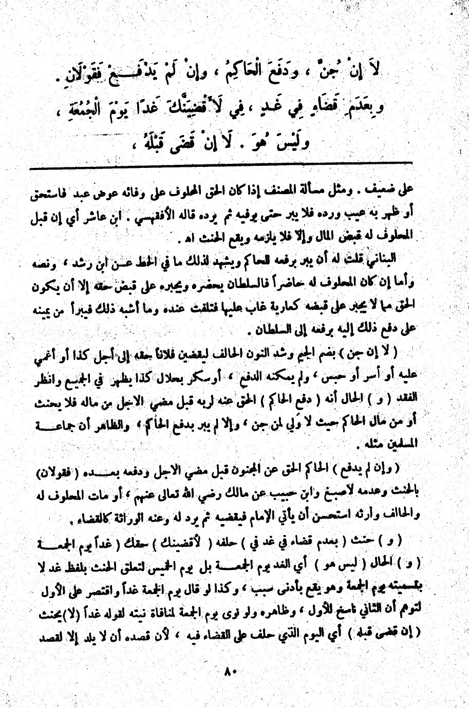وَبِعَدَمِ قَضَاءٍ فِي غَدٍ، فِي لَأَقْضِيَنَّك غَدًا يَوْمَ الْجُمُعَةِ، وَلَيْسَ هُوَ. لَا إنْ قَضَى قَبْلَهُ،