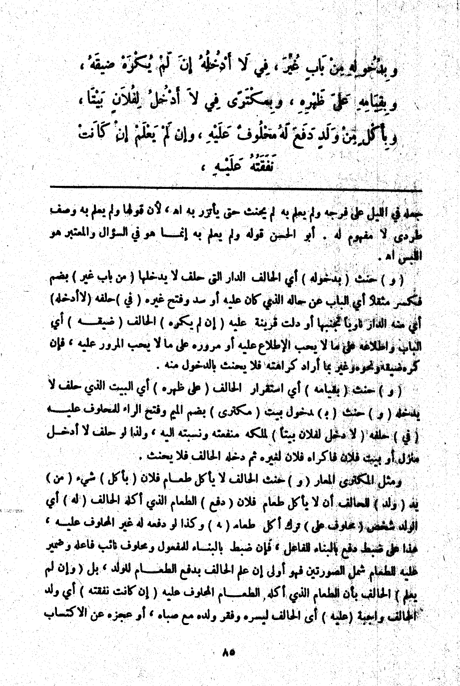 وَبِدُخُولِهِ مِنْ بَابٍ غُيِّرَ، فِي لَا أَدْخُلُهُ إنْ لَمْ يُكْرَهْ ضِيقُهُ، وَبِقِيَامِهِ عَلَى ظَهْرِهِ، وَبِمُكْتَرًى فِي لَا أَدْخُلُ لِفُلَانٍ بَيْتًا، وَبِأَكْلٍ مِنْ وَلَدٍ دَفَعَ لَهُ مَحْلُوفٌ عَلَيْهِ، وَإِنْ لَمْ يَعْلَمْ إنْ كَانَتْ نَفَقَتُهُ عَلَيْهِ