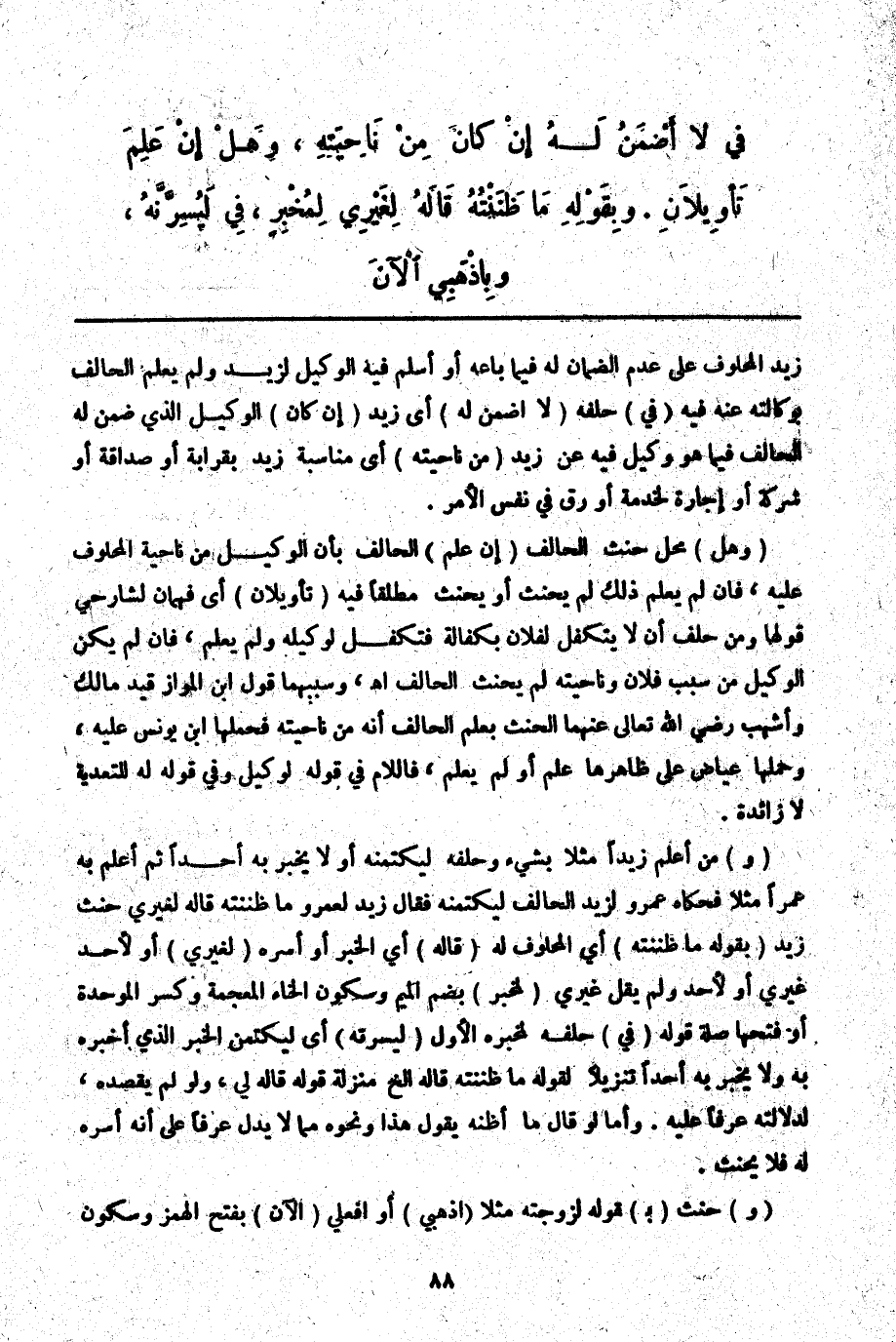 (وَهَلْ) مَحَلُّ حِنْثِ الْحَالِفِ (إنْ عَلِمَ) الْحَالِفُ بِأَنَّ الْوَكِيلَ مِنْ نَاحِيَةِ الْمَحْلُوفِ عَلَيْهِ، فَإِنْ لَمْ يَعْلَمْ ذَلِكَ لَمْ يَحْنَثْ أَوْ يَحْنَثُ مُطْلَقًا فِيهِ (تَأْوِيلَانِ) أَيْ فَهْمَانِ لِشَارِحِي قَوْلِهَا: وَمَنْ حَلَفَ أَنْ لَا يَتَكَفَّلَ لِفُلَانٍ بِكَفَالَةٍ فَتَكَفَّلَ لِوَكِيلِهِ وَلَمْ يَعْلَمْ، فَإِنْ لَمْ يَكُنْ الْوَكِيلُ مِنْ سَبَبِ فُلَانٍ وَنَاحِيَتِهِ لَمْ يَحْنَثْ الْحَالِفُ. اهـ. وَسَبَبُهُمَا قَوْلُ ابْنِ الْمَوَّازِ قَيَّدَ مَالِكٌ وَأَشْهَبُ - رَضِيَ اللَّهُ تَعَالَى عَنْهُمَا - الْحِنْثَ بِعِلْمِ الْحَالِفِ أَنَّهُ مِنْ نَاحِيَتِهِ فَحَمَلَهَا ابْنُ يُونُسَ عَلَيْهِ، وَحَمَلَهَا عِيَاضٌ عَلَى ظَاهِرِهَا عَلِمَ أَوْ لَمْ يَعْلَمْ، فَاللَّامُ فِي قَوْلِهِ لِوَكِيلٍ وَفِي قَوْلِهِ لَهُ لِلتَّعْدِيَةِ لَا زَائِدَةٍ.