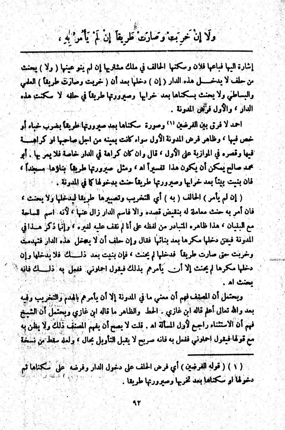 ـــــــــــــــــــــــــــــQإشَارَةٍ إلَيْهَا فَبَاعَهَا فُلَانٌ وَسَكَنَهَا الْحَالِفُ فِي مِلْكِ مُشْتَرِيهَا إنْ لَمْ يَنْوِ عَيْنَهَا (وَلَا) يَحْنَثُ مَنْ حَلَفَ لَا يَدْخُلُ هَذِهِ الدَّارَ (إنْ) دَخَلَهَا بَعْدَ أَنْ (خَرِبَتْ وَصَارَتْ طَرِيقًا) الْعِلْمِيُّ وَالْبِسَاطِيُّ وَلَا يَحْنَثُ بِسُكْنَاهَا بَعْدَ خَرَابِهَا وَصَيْرُورَتِهَا طَرِيقًا فِي حَلِفِهِ لَا سَكَنْت هَذِهِ الدَّارَ، وَالْأَوَّلُ فَرْضُ الْمُدَوَّنَةِ. أَحْمَدُ لَا فَرْقَ بَيْنَ الْفَرْضَيْنِ وَصُورَةُ سُكْنَاهَا بَعْدَ صَيْرُورَتِهَا طَرِيقًا بِضَرْبِ خِبَاءٍ أَوْ خُصٍّ فِيهَا، وَظَاهِرُ فَرْضِ الْمُدَوَّنَةِ الْأَوَّلُ سَوَاءٌ كَانَتْ يَمِينُهُ مِنْ أَجْلِ صَاحِبِهَا أَوْ كَرَاهَةً فِيهَا وَقَصَرَهُ فِي الْمَوَّازِيَّةِ عَلَى الْأَوَّلِ، قَالَ وَإِنْ كَانَ كَرَاهَةً فِي الدَّارِ خَاصَّةً فَلَا يَمُرُّ بِهَا. أَبُو مُحَمَّدٍ صَالِحٌ يُمْكِنُ أَنْ يَكُونَ هَذَا تَفْسِيرًا. اهـ. وَمِثْلُ صَيْرُورَتِهَا طَرِيقًا بِنَاؤُهَا مَسْجِدًا، فَإِنْ بُنِيَتْ بَيْتًا بَعْدَ خَرَابِهَا وَصَيْرُورَتِهَا طَرِيقًا حَنِثَ بِدُخُولِهَا كَمَا فِي الْمُدَوَّنَةِ.
