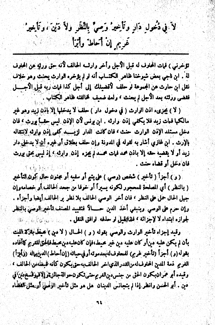 (وَ) أَجْزَأَ (تَأْخِيرُ) شَخْصٍ (وَصِيٍّ) عَلَى يَتِيمٍ أَوْ سَفِيهٍ أَوْ مَجْنُونٍ حَالَ كَوْنِ التَّأْخِيرِ (بِالنَّظَرِ) أَيْ الْمَصْلَحَةِ لِلْمَحْجُورِ لِكَوْنِهِ يَسِيرًا أَوْ خَوْفًا مِنْ جَحْدِ الْحَالِفِ أَوْ خِصَامِهِ وَإِنْ جُهِلَ الْحَالُ حُمِلَ عَلَى النَّظَرِ، فَإِنْ أَخَّرَ الْوَصِيُّ الْحَالِفَ بِلَا نَظَرٍ بَرَّ الْحَالِفُ أَيْضًا وَأَجْزَأَهُ. وَإِنْ حَرُمَ عَلَى الْوَصِيِّ وَيَنْبَغِي أَخْذُ الدَّيْنِ حَالًا فَتَقْيِيدُ الْمُصَنِّفِ تَأْخِيرَ الْوَصِيِّ بِالنَّظَرِ لِجَوَازِهِ ابْتِدَاءً لَا لِإِجْزَائِهِ، فَلِذَا قِيلَ لَوْ حَذَفَهُ لَوَافَقَ النَّقْلَ.