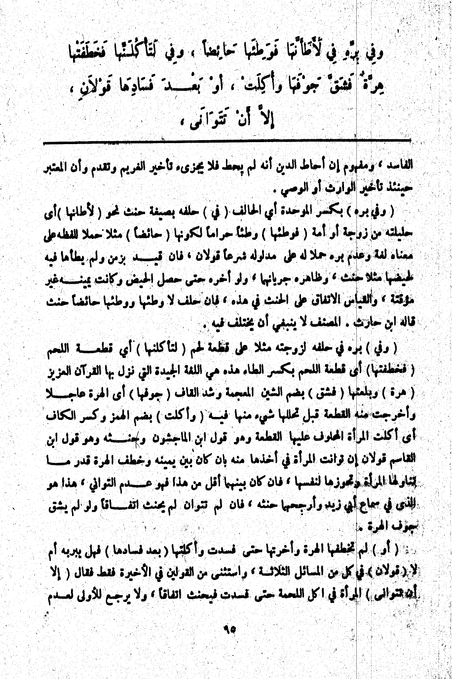 (وَفِي بِرِّهِ) بِكَسْرِ الْمُوَحَّدَةِ أَيْ الْحَالِفِ (فِي) حَلِفِهِ بِصِيغَةِ حِنْثٍ نَحْوُ (لَأَطَأَنَّهَا) أَيْ حَلِيلَتَهُ مِنْ زَوْجَةٍ أَوْ أَمَةٍ (فَوَطِئَهَا) وَطْئًا حَرَامًا لِكَوْنِهَا (حَائِضًا) مَثَلًا حَمْلًا لِلَفْظِهِ عَلَى مَعْنَاهُ لُغَةً وَعَدَمِ بِرِّهِ حَمْلًا لَهُ عَلَى مَدْلُولِهِ شَرْعًا قَوْلَانِ، فَإِنْ قَيَّدَ بِزَمَنٍ وَلَمْ يَطَأْهَا فِيهِ لِحَيْضِهَا مَثَلًا حَنِثَ، وَظَاهِرُهُ جَرَيَانُهُمَا، وَلَوْ أَخَّرَهُ حَتَّى حَصَلَ الْحَيْضُ وَكَانَتْ يَمِينُهُ غَيْرَ مُؤَقَّتَةٍ، وَالْقِيَاسُ الِاتِّفَاقُ عَلَى الْحِنْثِ فِي هَذِهِ، فَإِنْ حَلَفَ لَا وَطِئَهَا وَوَطِئَهَا حَائِضًا حَنِثَ قَالَهُ ابْنُ حَارِثٍ. الْمُصَنِّفُ لَا يَنْبَغِي أَنْ يُخْتَلَفَ فِيهِ.
