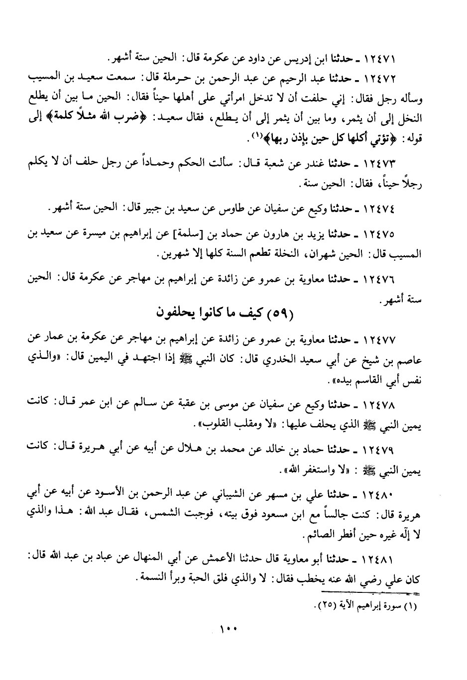 12473 - غُنْدَرٌ، عَنْ شُعْبَةَ، قَالَ: سَأَلْتُ الْحَكَمَ، وَحَمَّادًا، عَنْ رَجُلٍ حَلَفَ أَنْ لَا يُكَلِّمَ رَجُلًا حِينًا، فَقَالَ: " §الْحِينُ: سَنَةٌ "