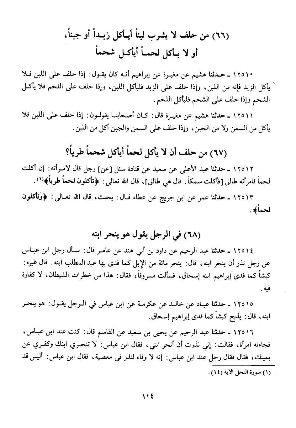 12514 - عَبْدُ الرَّحِيمِ، عَنْ دَاوُدَ بْنِ أَبِي هِنْدٍ، عَنْ عَامِرٍ، قَالَ: سَأَلَ رَجُلٌ ابْنَ عَبَّاسٍ، عَنْ §رَجُلٍ نَذَرَ أَنْ يَنْحَرَ ابْنَهُ، قَالَ: «يَنْحَرُ مِائَةً مِنَ الْإِبِلِ كَمَا فَدَى بِهَا عَبْدُ الْمُطَّلِبِ ابْنَهُ». قَالَ غَيْرُهُ: «كَبْشًا كَمَا فَدَى إِبْرَاهِيمُ ابْنَهُ إِسْحَاقَ». فَسَأَلْتُ مَسْرُوقًا فَقَالَ: «هَذَا مِنْ خَطَرَاتِ الشَّيْطَانِ، لَا كَفَّارَةَ فِيهِ»