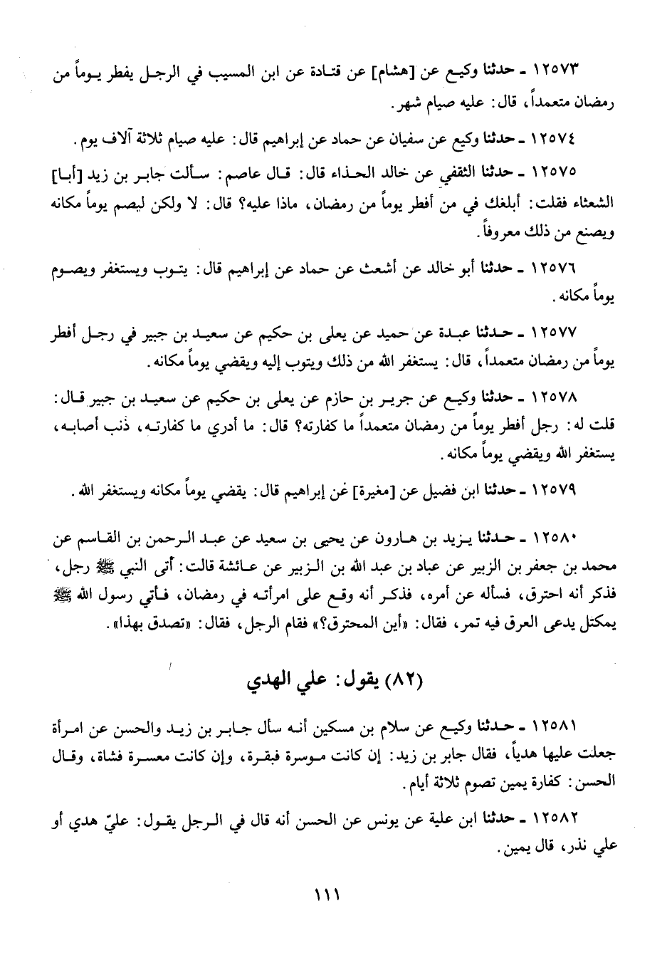 12578 - وَكِيعٌ، عَنْ جَرِيرِ بْنِ حَازِمٍ، عَنْ يَعْلَى بْنِ حَكِيمٍ، عَنْ سَعِيدِ بْنِ جُبَيْرٍ، قَالَ: قُلْتُ لَهُ: §رَجُلٌ أَفْطَرَ يَوْمًا مِنْ رَمَضَانَ مُتَعَمِّدًا، مَا كَفَّارَتُهُ؟ قَالَ: «مَا أَدْرِي مَا كَفَّارَتُهُ، ذَنْبٌ أَصَابَهُ، يَسْتَغْفِرُ اللَّهَ، وَيَقْضِي يَوْمًا مَكَانَهُ»
