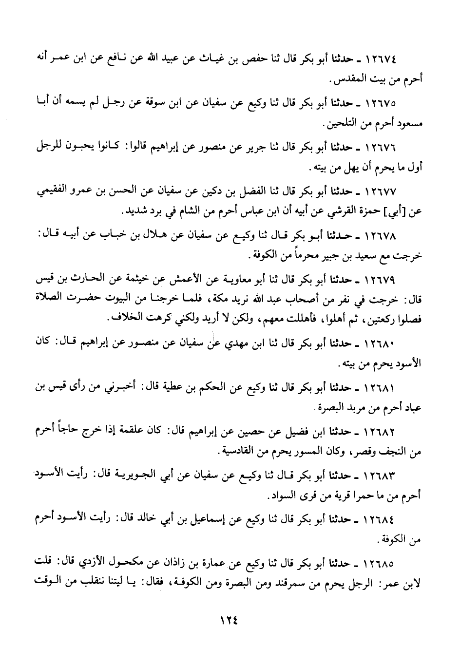 12684 - أَبُو بَكْرٍ قَالَ: ثنا وَكِيعٌ، عَنْ إِسْمَاعِيلَ بْنِ أَبِي خَالِدٍ قَالَ: «رَأَيْتُ الْأَسْوَدَ §أَحْرَمَ مِنَ الْكُوفَةِ»