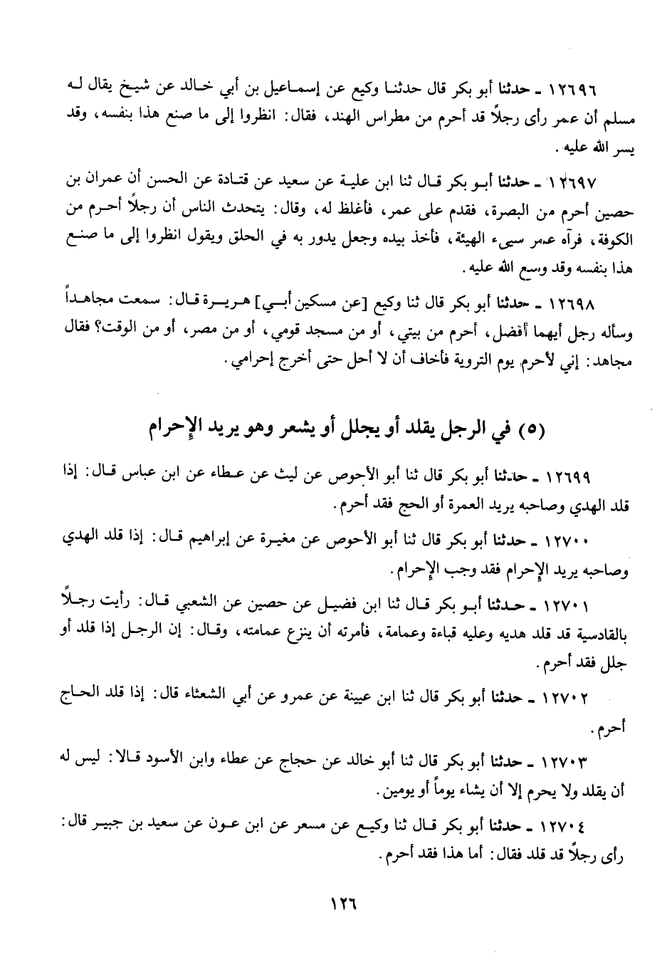 12701 - أَبُو بَكْرٍ قَالَ: ثنا ابْنُ فُضَيْلٍ، عَنْ حُصَيْنٍ، عَنِ الشَّعْبِيِّ قَالَ: «رَأَيْتُ رَجُلًا بِالْقَادِسِيَّةِ قَدْ قَلَّدَ هَدْيَهُ، وَعَلَيْهِ قَبَاءَةُ وَعِمَامَةٌ، فَأَمَرْتُهُ أَنْ يَنْزِعَ عِمَامَتَهُ» وَقَالَ: «إِنَّ §الرَّجُلَ إِذَا قَلَّدَ أَوْ جَلَّلَ فَقَدْ أَحْرَمَ»
