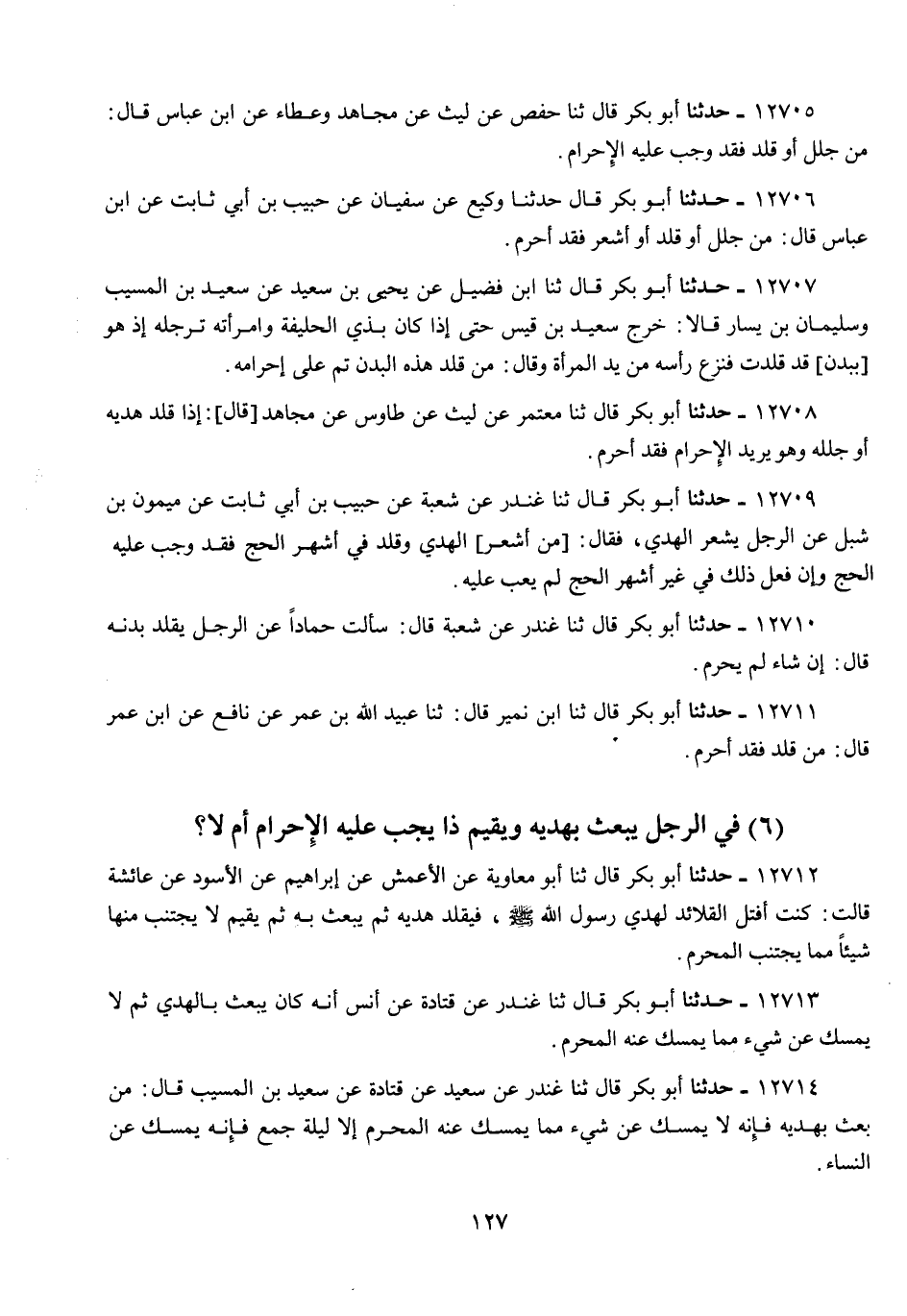 12710 - أَبُو بَكْرٍ قَالَ: ثنا غُنْدَرٌ، عَنْ شُعْبَةَ، قَالَ: سَأَلْتُ حَمَّادًا، عَنِ الرَّجُلِ §يُقَلِّدُ بُدْنَهُ قَالَ: «إِنْ شَاءَ لَمْ يُحْرِمْ»
