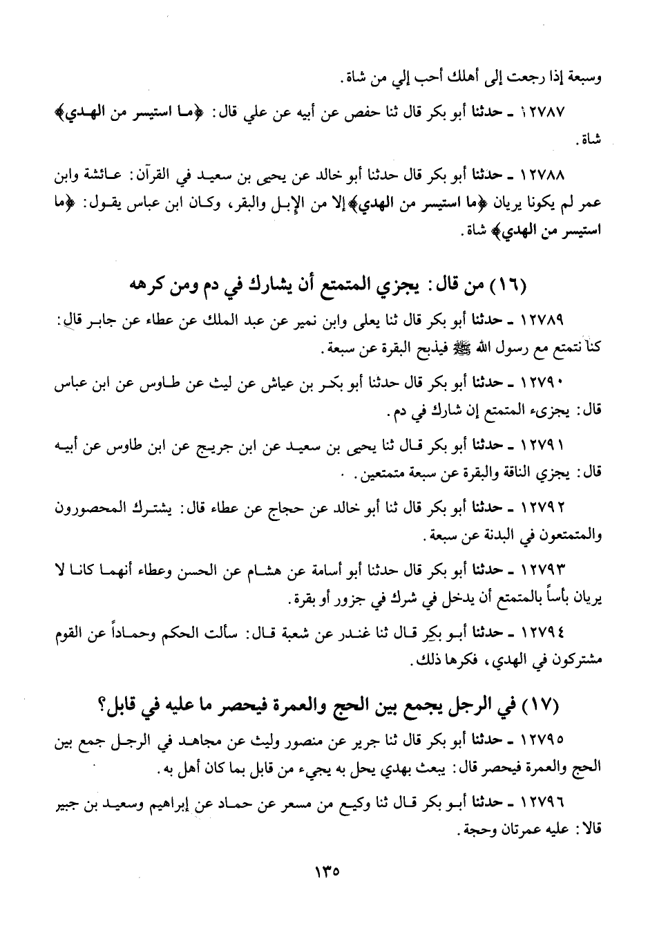 12794 - أَبُو بَكْرٍ قَالَ: ثنا غُنْدَرٌ، عَنْ شُعْبَةَ، قَالَ: سَأَلْتُ الْحَكَمَ، وَحَمَّادًا، عَنْ §الْقَوْمِ مُشْتَرَكُونَ فِي الْهَدْيِ، «فَكَرِهَا ذَلِكَ»