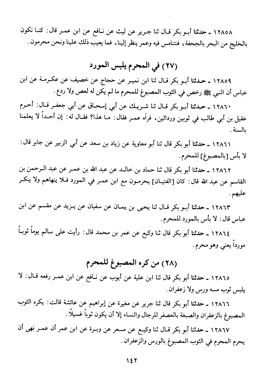12865 - أَبُو بَكْرٍ قَالَ: ثنا ابْنُ عُلَيَّةَ، عَنْ أَيُّوبَ، عَنْ نَافِعٍ، عَنِ ابْنِ عُمَرَ، رَفَعَهُ قَالَ: «§لَا يُلْبَسُ ثَوْبٌ مَسَّهُ وَرْسٌ، وَلَا زَعْفَرَانٌ»