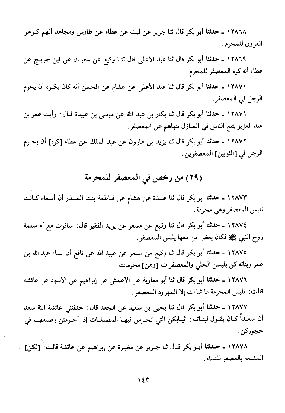 12874 - أَبُو بَكْرٍ قَالَ: ثنا وَكِيعٌ، عَنْ مِسْعَرٍ، عَنْ يَزِيدَ الْفَقِيرِ قَالَ: «§سَافَرْتُ مَعَ أُمِّ سَلَمَةَ زَوْجِ النَّبِيِّ صَلَّى اللهُ عَلَيْهِ وَسَلَّمَ، فَكَانَ بَعْضُ مَنْ مَعَهَا يَلْبَسُ الْمُعَصْفَرَ»