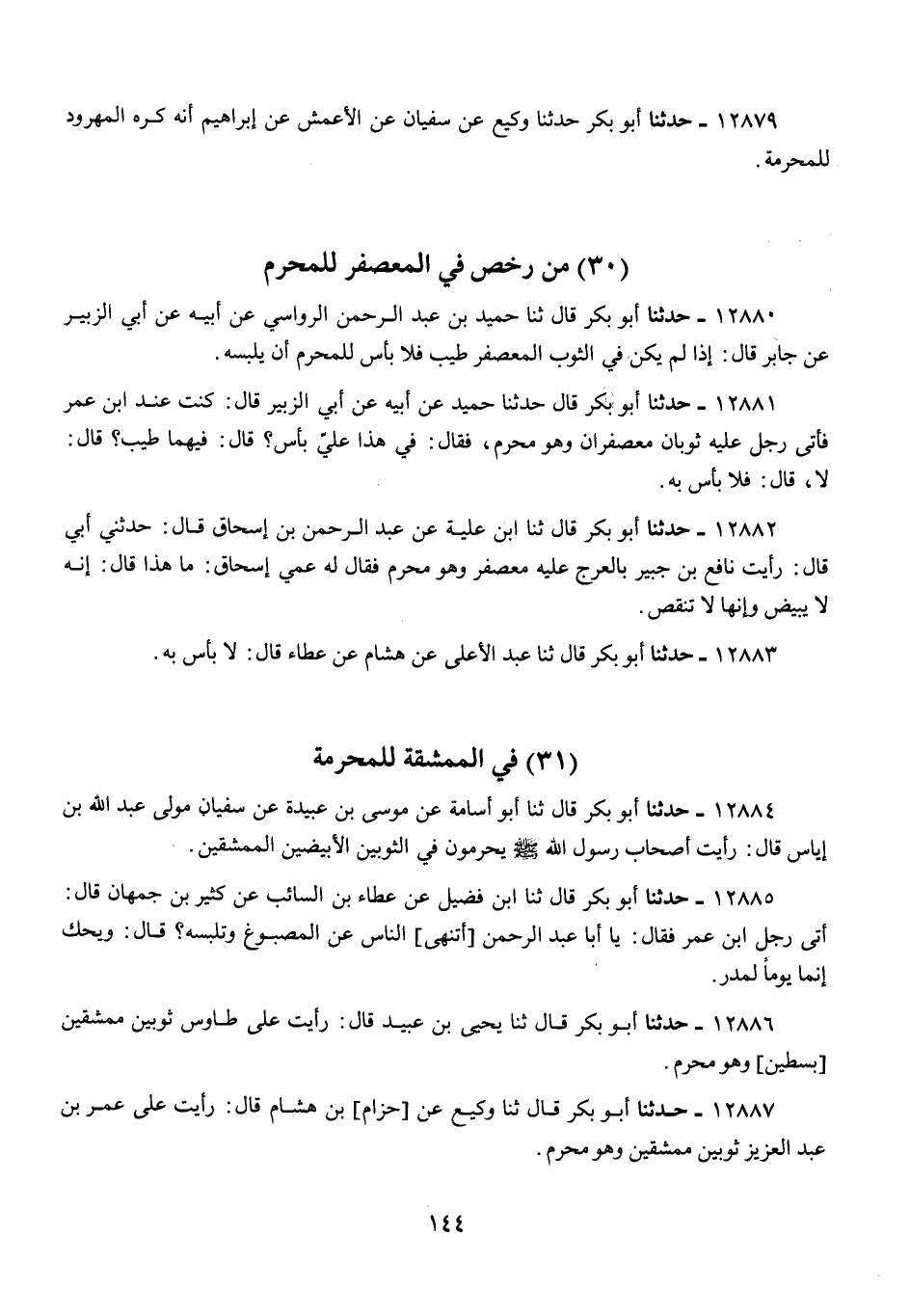 12880 - أَبُو بَكْرٍ قَالَ: ثنا حُمَيْدُ بْنُ عَبْدِ الرَّحْمَنِ الرُّوَاسِيُّ، عَنْ أَبِيهِ، عَنْ أَبِي الزُّبَيْرِ، عَنْ جَابِرٍ قَالَ: «§إِذَا لَمْ يَكُنْ فِي الثَّوْبِ الْمُعَصْفَرِ طِيبٌ، فَلَا بَأْسَ لِلْمُحْرِمِ أَنْ يَلْبَسَهُ»
