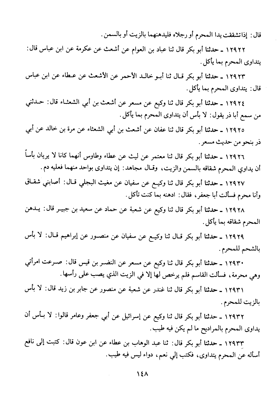 12929 - أَبُو بَكْرٍ قَالَ: ثنا وَكِيعٌ، عَنْ سُفْيَانَ، عَنْ مَنْصُورٍ، عَنْ إِبْرَاهِيمَ قَالَ: «§لَا بَأْسَ بِالشَّحْمِ لِلْمُحْرِمِ»