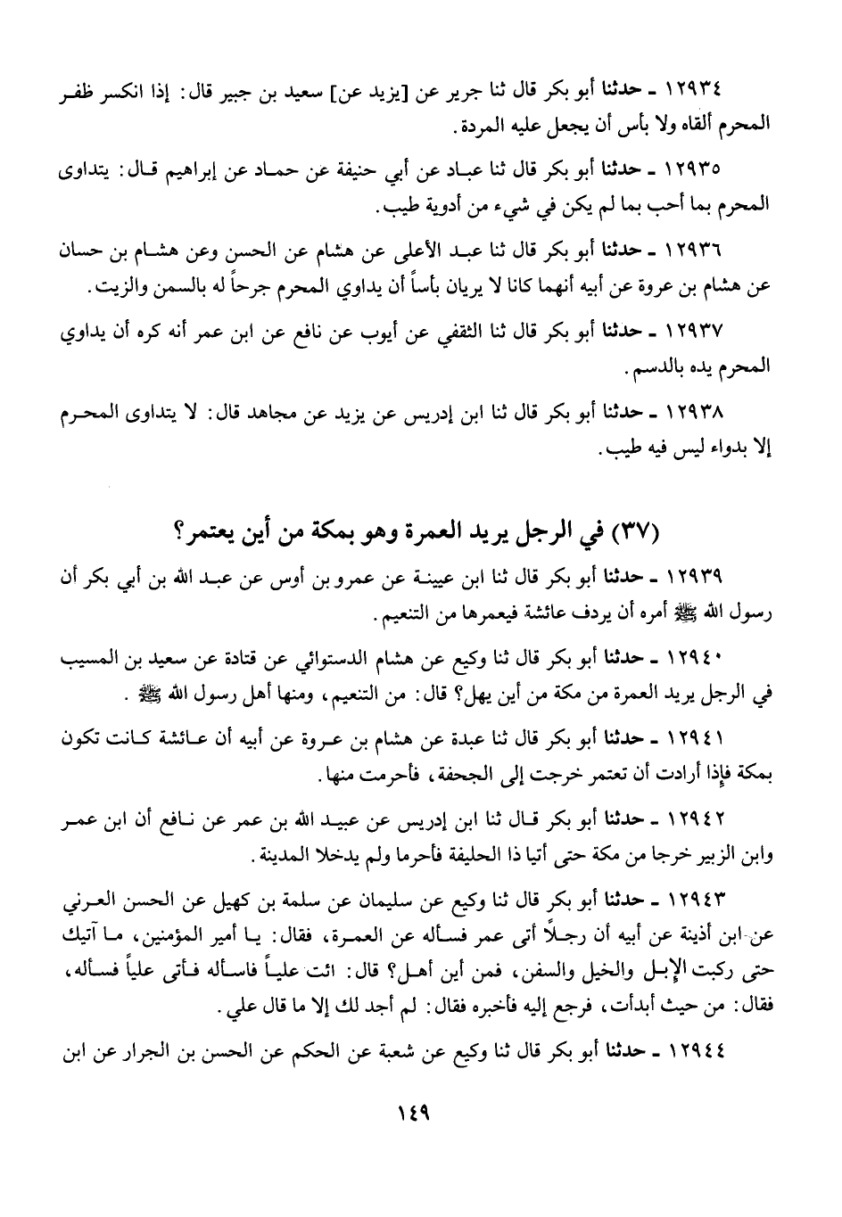12940 - أَبُو بَكْرٍ قَالَ: ثنا وَكِيعٌ، عَنْ هِشَامٍ الدَّسْتُوَائِيِّ، عَنْ قَتَادَةَ، عَنْ سَعِيدِ بْنِ الْمُسَيِّبِ، فِي الرَّجُلِ يُرِيدُ الْعُمْرَةَ مِنْ مَكَّةَ مِنْ أَيْنَ يُهِلُّ؟ قَالَ: «§مِنَ التَّنْعِيمِ، وَمِنْهَا أَهَلَّ رَسُولُ اللَّهِ صَلَّى اللهُ عَلَيْهِ وَسَلَّمَ»