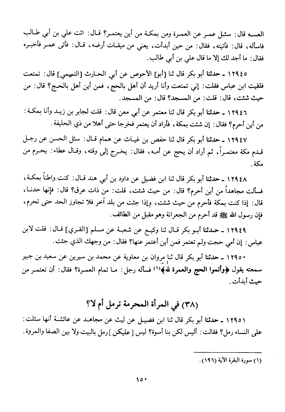 12950 - أَبُو بَكْرٍ قَالَ: ثنا مَرْوَانُ بْنُ مُعَاوِيَةَ، عَنْ مُحَمَّدِ بْنِ سِيرِينَ، عَنْ سَعِيدِ بْنِ جُبَيْرٍ سَمِعْتُهُ يَقُولُ: {§وَأَتِمُّوا الْحَجَّ وَالْعُمْرَةَ لِلَّهِ} [البقرة: 196] فَسَأَلَهُ رَجُلٌ: مَا تَمَامُ الْعُمْرَةِ؟ فَقَالَ: «أَنْ تَعْتَمِرَ مِنْ حَيْثُ أَبْدَأْتَ»