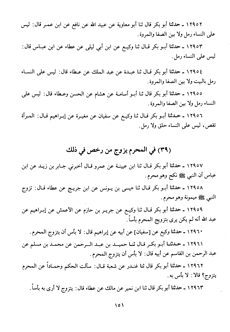 12959 - أَبُو بَكْرٍ قَالَ: ثنا وَكِيعٌ، عَنْ جَرِيرِ بْنِ حَازِمٍ، عَنِ الْأَعْمَشِ، عَنْ إِبْرَاهِيمَ، عَنْ عَبْدِ اللَّهِ، «أَنَّهُ §لَمْ يَكُنْ يَرَى بِتَزْوِيجِ الْمُحْرِمِ بَأْسًا»