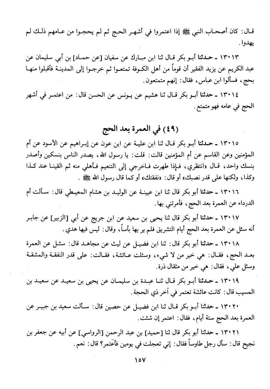 13020 - أَبُو بَكْرٍ قَالَ: ثنا ابْنُ فُضَيْلٍ، عَنْ حُصَيْنٍ، قَالَ: سَأَلْتُ سَعِيدَ بْنَ جُبَيْرٍ، عَنْ §الْعُمْرَةِ بَعْدَ الْحَجِّ سِتَّةَ أَيَّامٍ، فَقَالَ: «اعْتَمِرْ إِنْ شِئْتَ»