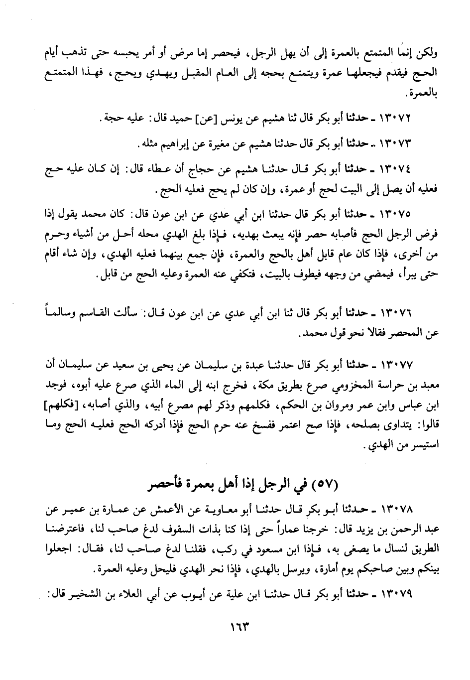 13076 - أَبُو بَكْرٍ قَالَ: ثنا ابْنُ أَبِي عَدِيٍّ، عَنِ ابْنِ عَوْنٍ، قَالَ: سَأَلْتُ الْقَاسِمَ، وَسَالِمًا عَنِ الْمُحْصَرِ، فَقَالَا نَحْوَ قَوْلِ مُحَمَّدٍ