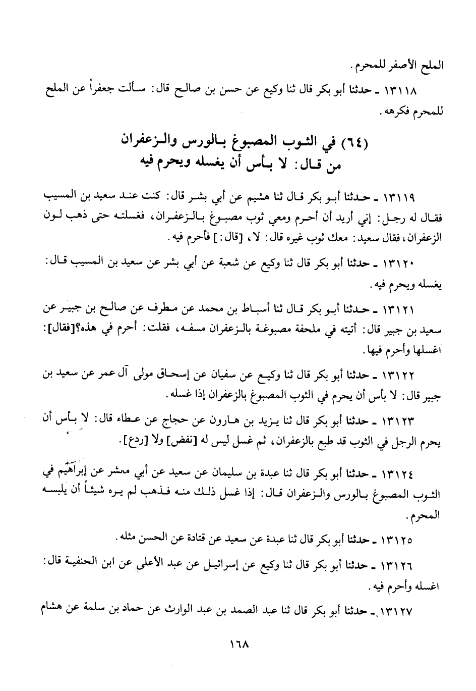 13121 - أَبُو بَكْرٍ قَالَ: ثنا أَسْبَاطُ بْنُ مُحَمَّدٍ، عَنْ مُطَرِّفٍ، عَنْ صَالِحِ بْنِ جُبَيْرٍ، عَنْ سَعِيدِ بْنِ جُبَيْرٍ قَالَ: «§أَتَيْتُهُ فِي مِلْحَفَةٍ مَصْبُوغَةٍ بِالزَّعْفَرَانِ مُسَفَّةٍ» فَقُلْتُ: أُحْرِمُ فِي هَذِهِ؟ فَقَالَ: «اغْسِلْهَا وَأَحْرِمْ فِيهَا»