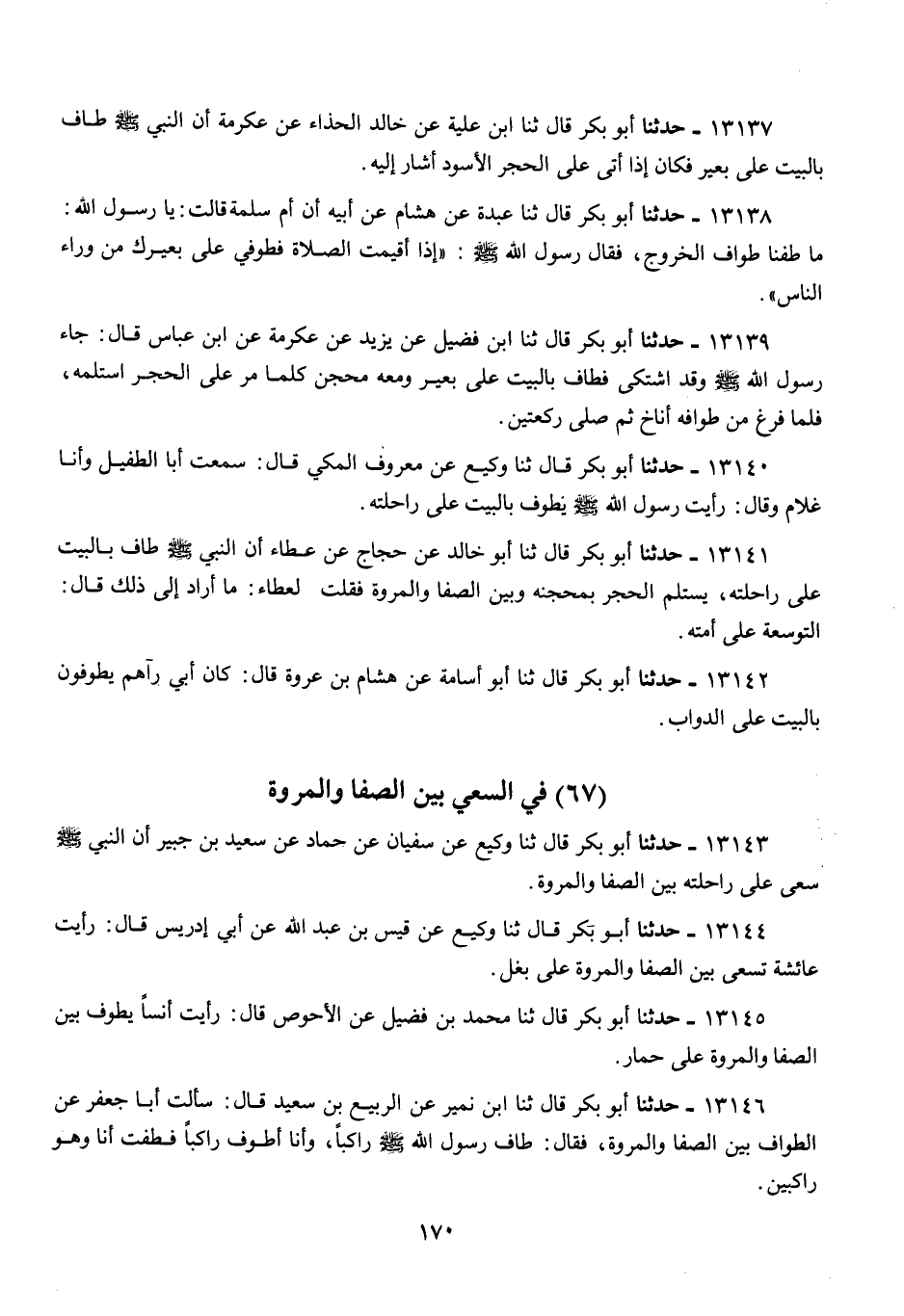 13143 - أَبُو بَكْرٍ قَالَ: ثنا وَكِيعٌ، عَنْ سُفْيَانَ، عَنْ حَمَّادٍ، عَنْ سَعِيدِ بْنِ جُبَيْرٍ «أَنَّ النَّبِيَّ صَلَّى اللهُ عَلَيْهِ وَسَلَّمَ §سَعَى عَلَى رَاحِلَتِهِ بَيْنَ الصَّفَا وَالْمَرْوَةِ»