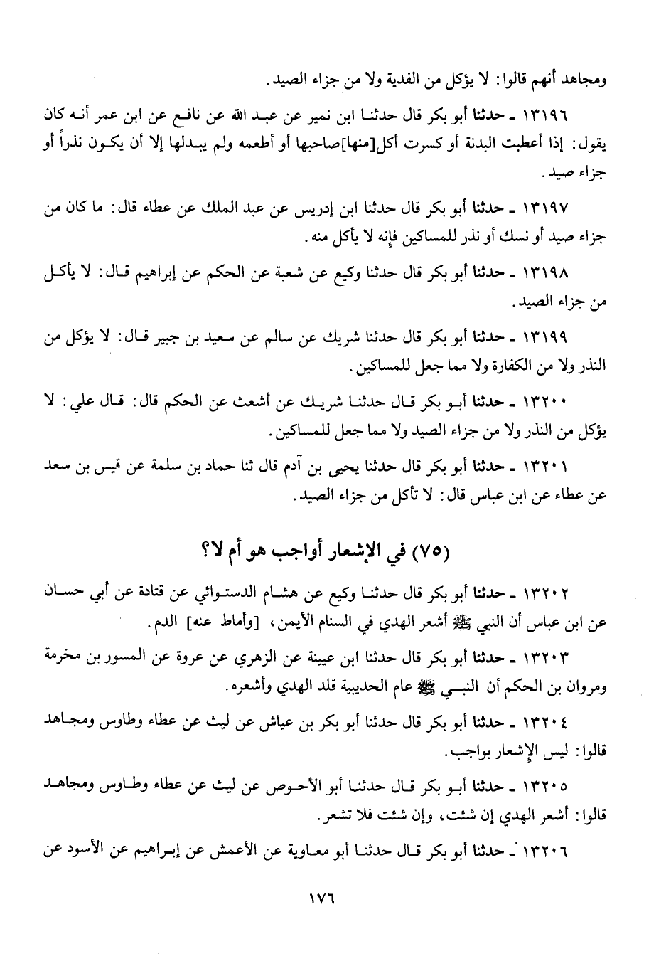 13204 - أَبُو بَكْرٍ قَالَ: حَدَّثَنَا أَبُو بَكْرِ بْنُ عَيَّاشٍ، عَنْ لَيْثٍ، عَنْ عَطَاءٍ، وَطَاوُسٍ، وَمُجَاهِدٍ، قَالُوا: «§لَيْسَ الْإِشْعَارُ بِوَاجِبٍ»