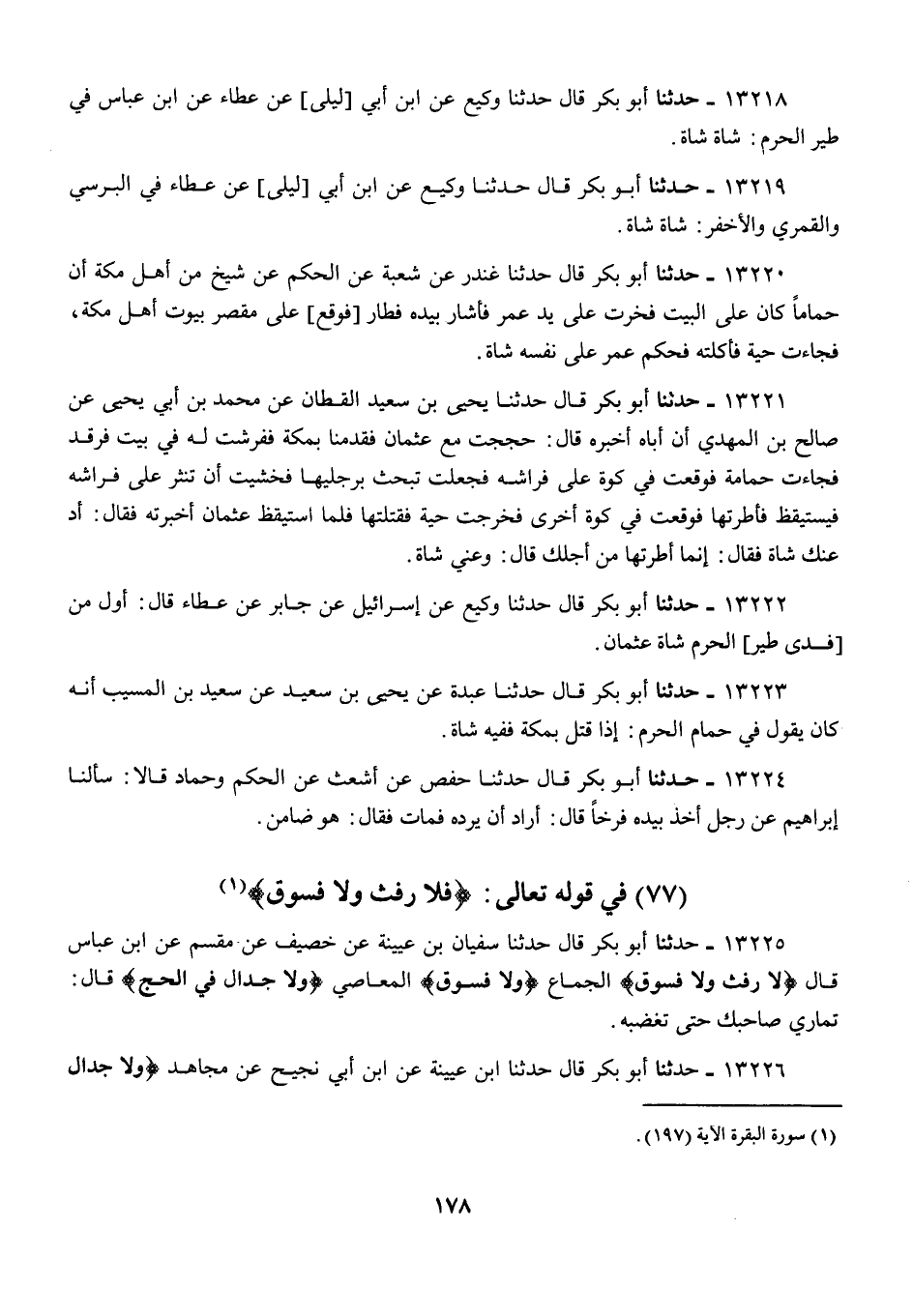 13225 - أَبُو بَكْرٍ قَالَ: حَدَّثَنَا سُفْيَانُ بْنُ عُيَيْنَةَ، عَنْ خُصَيْفٍ، عَنْ مِقْسَمٍ، عَنِ ابْنِ عَبَّاسٍ قَالَ: {§لَا رَفَثَ}: «الْجِمَاعُ»، {وَلَا فُسُوقَ} [البقرة: 197]: «الْمَعَاصِي»، {وَلَا جِدَالَ فِي الْحَجِّ} [البقرة: 197] قَالَ: «تُمَارِي صَاحِبَكَ حَتَّى تُغْضِبَهُ»