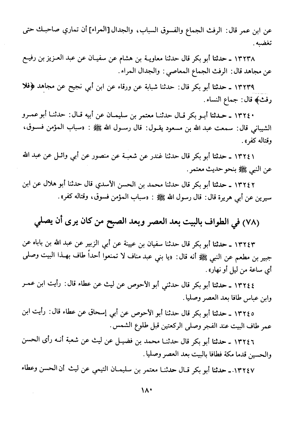13240 - أَبُو بَكْرٍ قَالَ: حَدَّثَنَا مُعْتَمِرُ بْنُ سُلَيْمَانَ، عَنْ أَبِيهِ، قَالَ: حَدَّثَنَا أَبُو عَمْرٍو الشَّيْبَانِيُّ، قَالَ: سَمِعْتُ عَبْدَ اللَّهِ بْنَ مَسْعُودٍ يَقُولُ: قَالَ رَسُولُ اللَّهِ صَلَّى اللهُ عَلَيْهِ وَسَلَّمَ: «§سِبَابُ الْمُؤْمِنِ فُسُوقٌ، وَقِتَالُهُ كُفْرٌ» حَدَّثَنَا