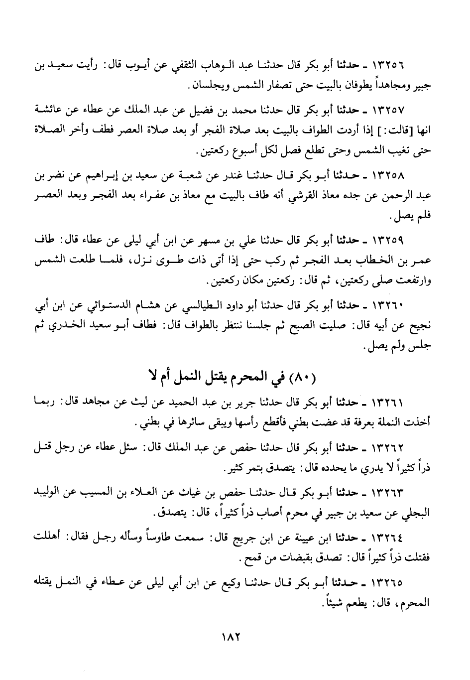 13266 - أَبُو بَكْرٍ قَالَ: حَدَّثَنَا وَكِيعٌ، عَنْ إِبْرَاهِيمَ بْنِ رَافِعٍ، قَالَ: سَأَلْتُ طَاوُسًا، عَنْ قَتْلِ الذَّرِّ فِي الْحَرَمِ، فَقَالَ: «§إِذَا آذَاكَ فَلَا بَأْسَ بِهِ»