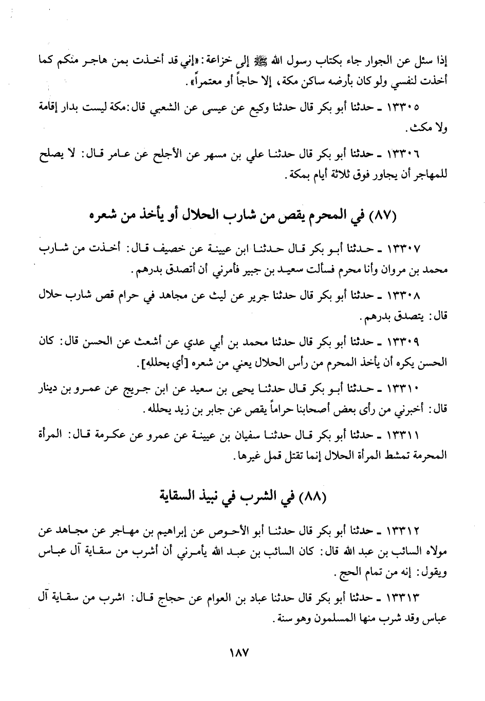 13312 - أَبُو بَكْرٍ قَالَ: حَدَّثَنَا أَبُو الْأَحْوَصِ، عَنْ إِبْرَاهِيمَ بْنِ مُهَاجِرٍ، عَنْ مُجَاهِدٍ، عَنْ مَوْلَاهُ السَّائِبِ بْنِ عَبْدِ اللَّهِ قَالَ: كَانَ السَّائِبُ بْنُ عَبْدِ اللَّهِ §يَأْمُرُنِي أَنْ أَشْرَبَ، مِنْ سِقَايَةِ آلِ عَبَّاسٍ وَيَقُولُ: «إِنَّهُ مِنْ تَمَامِ الْحَجِّ»