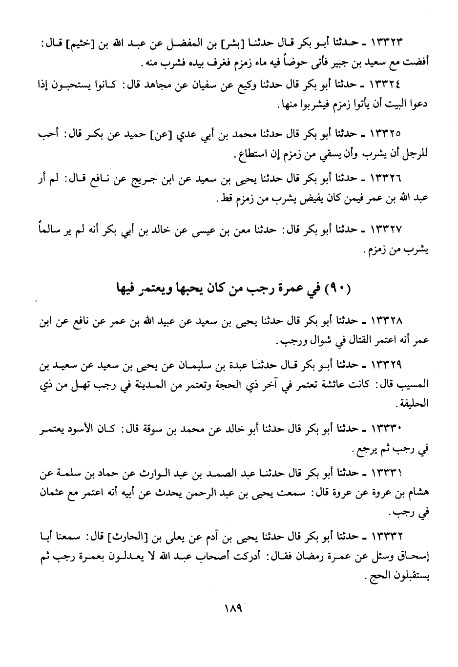 13332 - أَبُو بَكْرٍ قَالَ: حَدَّثَنَا يَحْيَى بْنُ آدَمَ، عَنْ يَعْلَى بْنِ الْحَارِثِ قَالَ: سَمِعْنَا أَبَا إِسْحَاقَ، وَسُئِلَ عَنْ عُمْرَةِ رَمَضَانَ، فَقَالَ: «§أَدْرَكْتُ أَصْحَابَ عَبْدِ اللَّهِ لَا يَعْدِلُونَ بِعُمْرَةِ رَجَبٍ، ثُمَّ يَسْتَقْبِلُونَ الْحَجَّ»