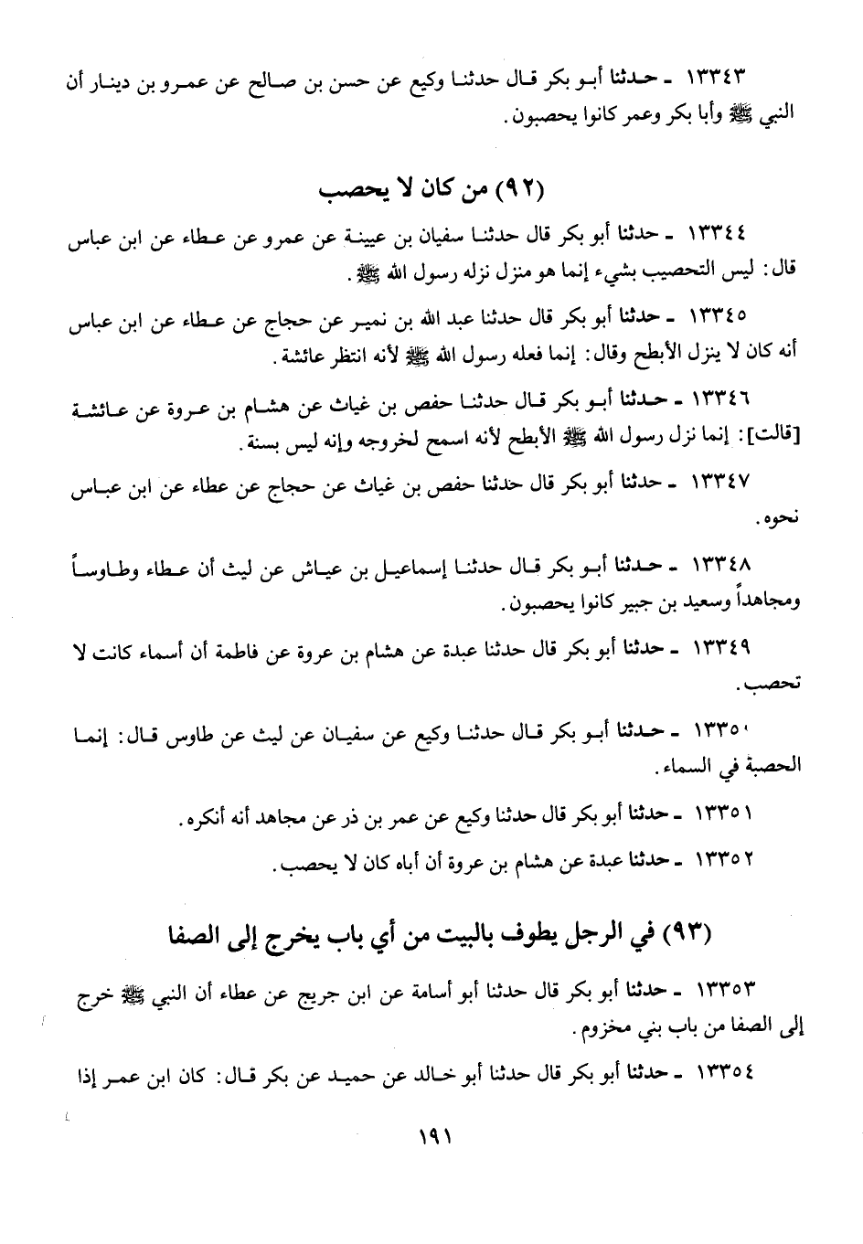 13349 - حَدَّثَنَا أَبُو بَكْرٍ قَالَ: حَدَّثَنَا عَبْدَةُ، عَنْ هِشَامِ بْنِ عُرْوَةَ، عَنْ فَاطِمَةَ، «أَنَّ أَسْمَاءَ كَانَتْ §لَا تُحَصِّبُ»