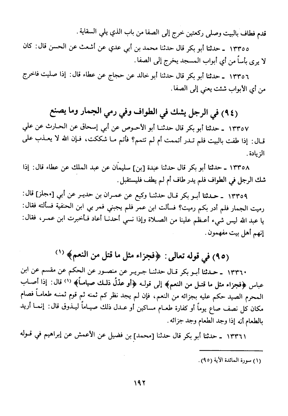 13361 - أَبُو بَكْرٍ قَالَ: حَدَّثَنَا مُحَمَّدُ بْنُ فُضَيْلٍ، عَنِ الْأَعْمَشِ، عَنْ إِبْرَاهِيمَ فِي قَوْلِهِ: {§وَمَنْ قَتَلَهُ مِنْكُمْ مُتَعَمِّدًا فَجَزَاءٌ مِثْلُ مَا قَتَلَ مِنَ النَّعَمِ يَحْكُمُ بِهِ ذَوَا عَدْلٍ مِنْكُمْ هَدْيًا بَالِغَ الْكَعْبَةِ} [المائدة: 95] " فَإِنْ لَمْ يَجِدْ قُوِّمَ عَلَيْهِ طَعَامٌ ثُمَّ قِيلَ لَهُ: صُمْ لِكُلِّ نِصْفِ صَاعٍ يَوْمًا "
