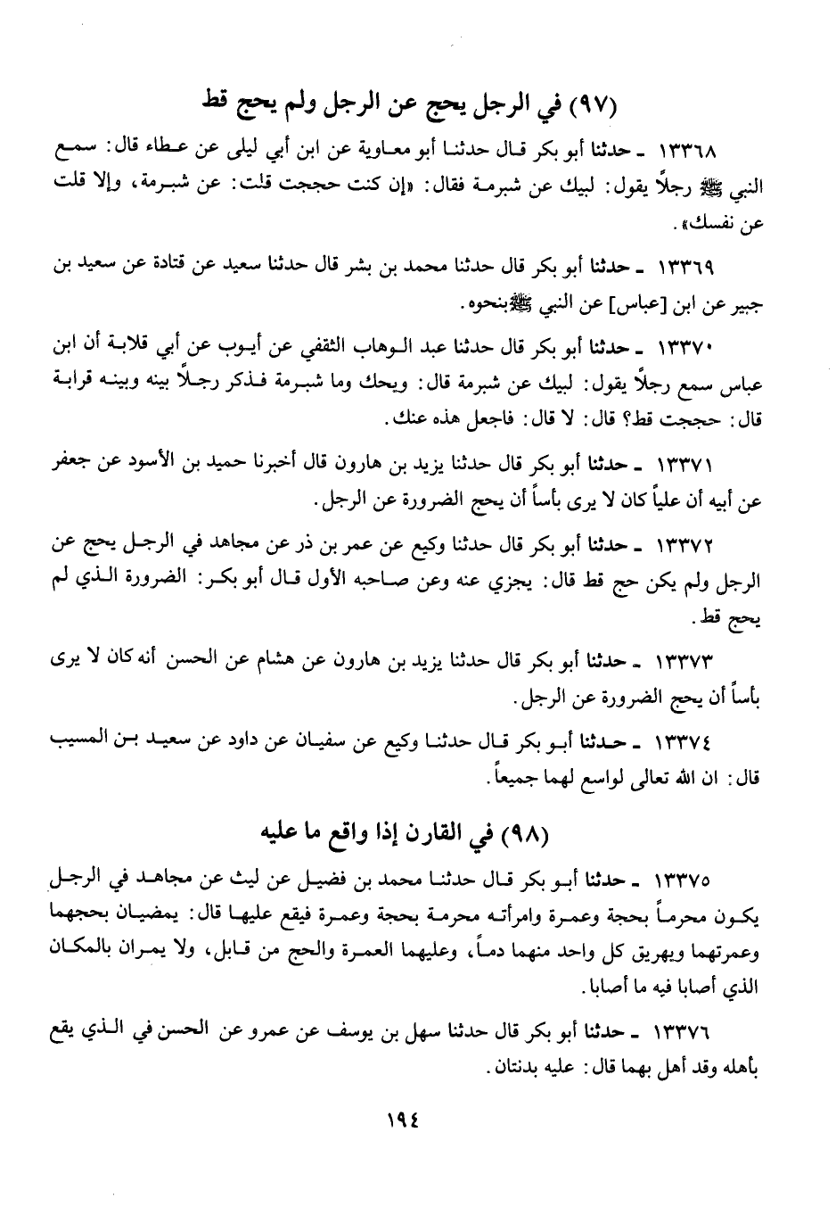 13370 - أَبُو بَكْرٍ قَالَ: حَدَّثَنَا عَبْدُ الْوَهَّابِ الثَّقَفِيُّ، عَنْ أَيُّوبَ، عَنْ أَبِي قِلَابَةَ، أَنَّ ابْنَ عَبَّاسٍ، سَمِعَ رَجُلًا يَقُولُ: لَبَّيْكَ عَنْ شُبْرُمَةَ قَالَ: «وَيْحَكَ، وَمَا شُبْرُمَةُ؟» فَذَكَرَ رَجُلًا بَيْنَهُ وَبَيْنَهُ قَرَابَةٌ، قَالَ: «§حَجَجْتَ قَطُّ؟» قَالَ: لَا، قَالَ: «فَاجْعَلْ هَذِهِ عَنْكَ»