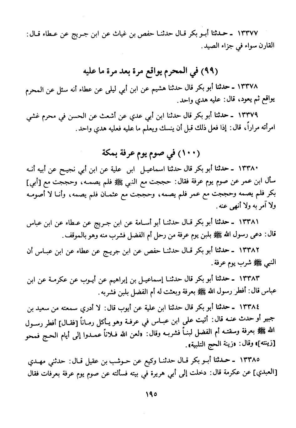 13384 - أَبُو بَكْرٍ قَالَ: حَدَّثَنَا ابْنُ عُلَيَّةَ، عَنْ أَيُّوبَ قَالَ: لَا أَدْرِي سَمِعْتُهُ مِنْ سَعِيدِ بْنِ جُبَيْرٍ أَوْ حُدِّثَ عَنْهُ، قَالَ: أَتَيْتُ عَلَى ابْنِ عَبَّاسٍ، فِي عَرَفَةَ وَهُوَ يَأْكُلُ رُمَّانًا، فَقَالَ: أَفْطَرَ رَسُولُ اللَّهِ صَلَّى اللهُ عَلَيْهِ وَسَلَّمَ بِعَرَفَةَ، وَسَقَتْهُ أُمُّ الْفَضْلِ لَبَنًا فَشَرِبَهُ وَقَالَ: «§لَعَنَ اللَّهُ فُلَانًا عَمَدُوا إِلَى أَيَّامِ الْحَجِّ، فَمَحَوْا زِينَتَهُ» وَقَالَ: «زِينَةُ الْحَجِّ التَّلْبِيَةُ»
