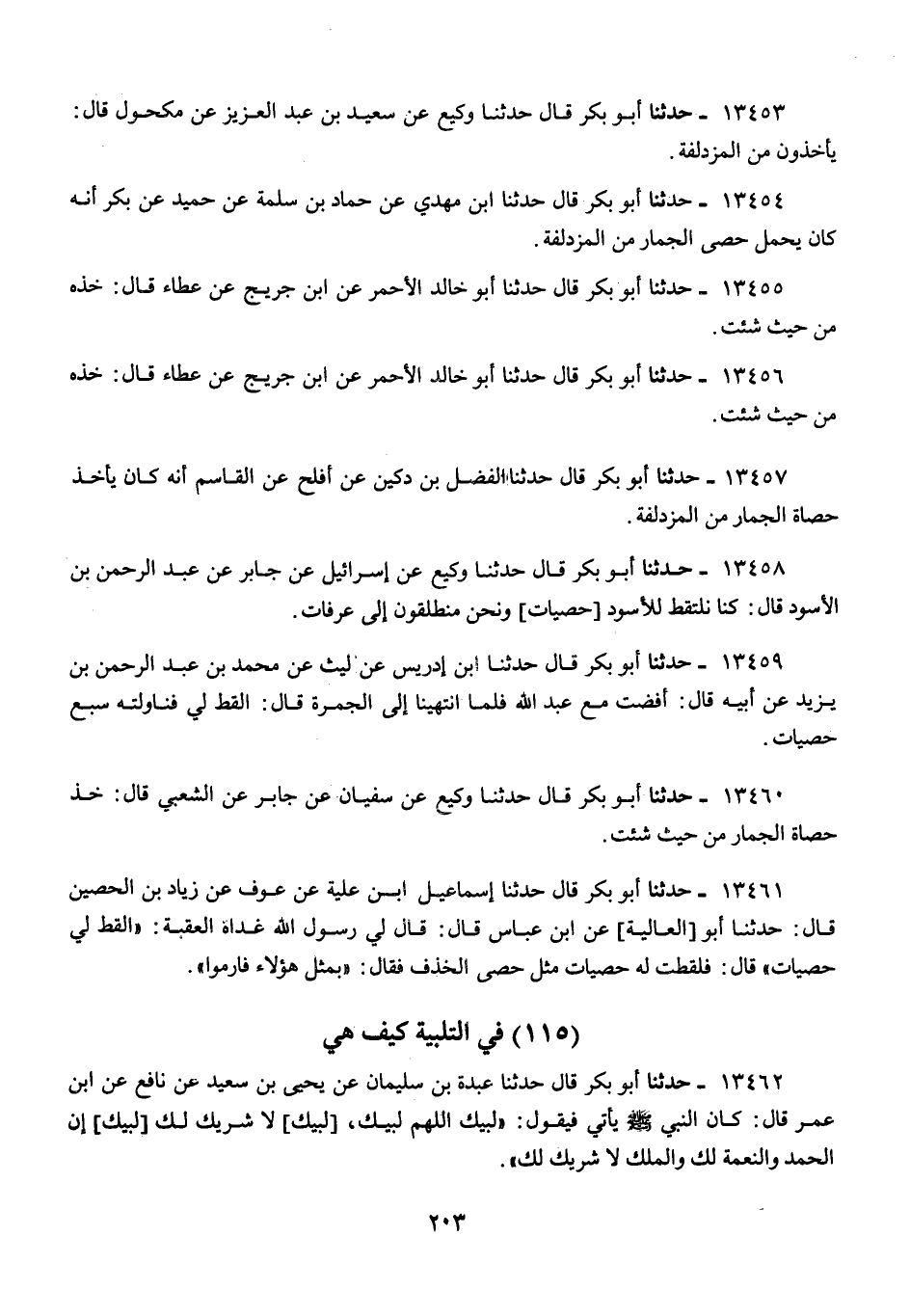 13458 - أَبُو بَكْرٍ قَالَ: حَدَّثَنَا وَكِيعٌ، عَنْ إِسْرَائِيلَ، عَنْ جَابِرٍ، عَنْ عَبْدِ الرَّحْمَنِ بْنِ الْأَسْوَدِ قَالَ: «كُنَّا §نَلْتَقِطُ لِلْأَسْوَدِ حَصَيَاتٍ، وَنَحْنُ مُنْطَلِقُونَ إِلَى عَرَفَاتٍ»