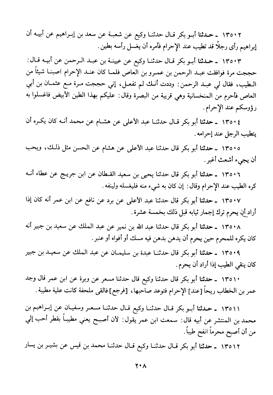13509 - أَبُو بَكْرٍ قَالَ: حَدَّثَنَا عَبْدَةُ بْنُ سُلَيْمَانَ، عَنْ عَبْدِ الْمَلِكِ، عَنْ سَعِيدِ بْنِ جُبَيْرٍ، «كَانَ §يُنَقِّي الطِّيبَ إِذَا أَرَادَ أَنْ يُحْرِمَ»