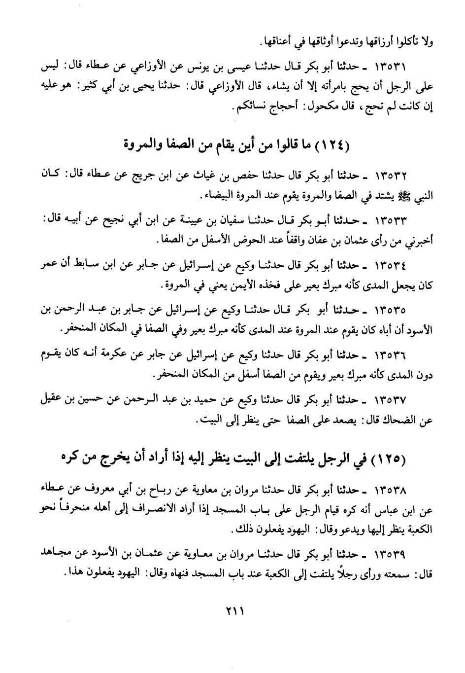 13532 - أَبُو بَكْرٍ قَالَ: حَدَّثَنَا حَفْصُ بْنُ غِيَاثٍ، عَنِ ابْنِ جُرَيْجٍ، عَنْ عَطَاءٍ قَالَ: «كَانَ النَّبِيُّ صَلَّى اللهُ عَلَيْهِ وَسَلَّمَ §يَشْتَدُّ فِي الصَّفَا وَالْمَرْوَةِ يَقُومُ عِنْدَ الْمَرْوَةِ الْبَيْضَاءِ»